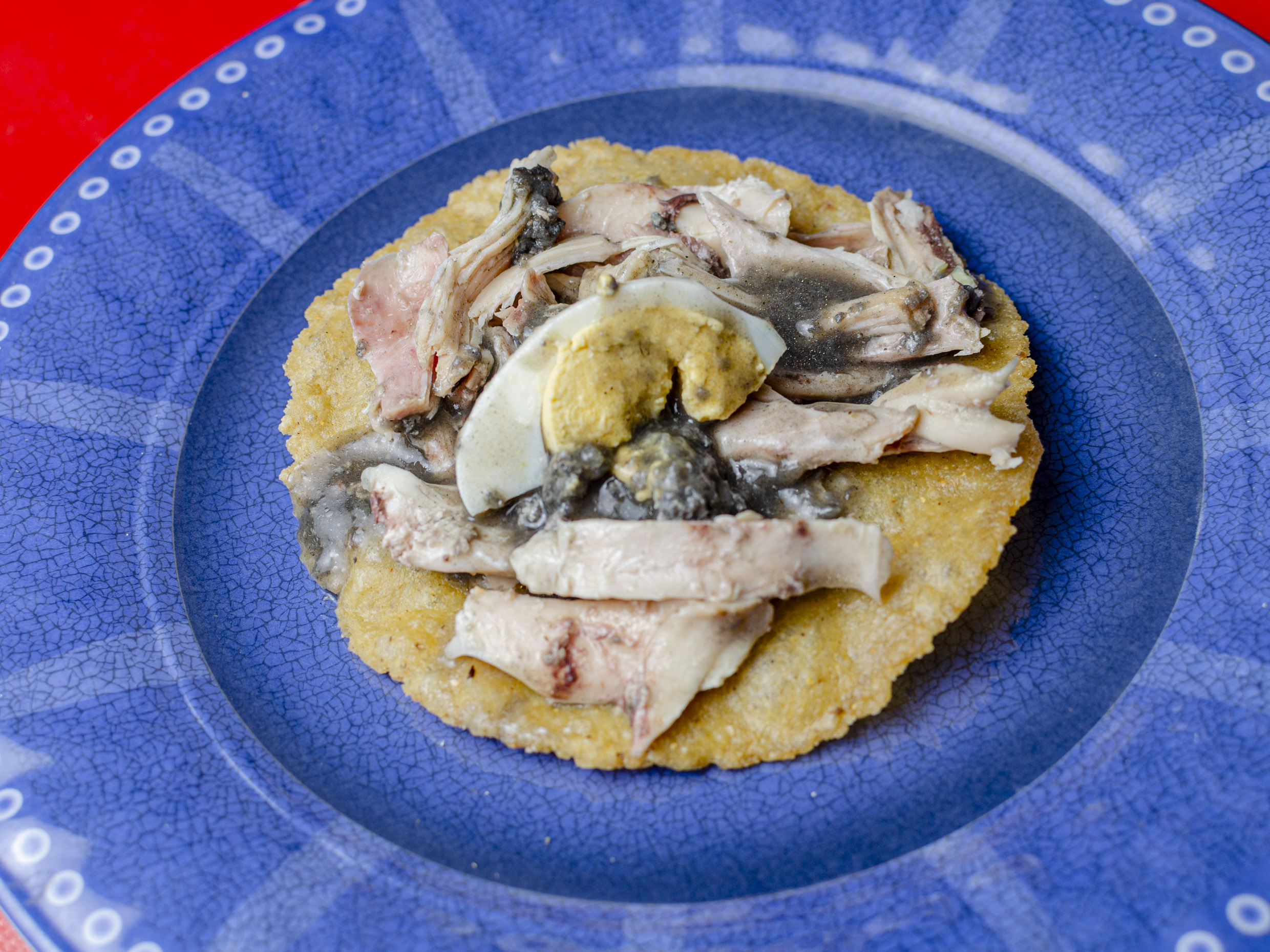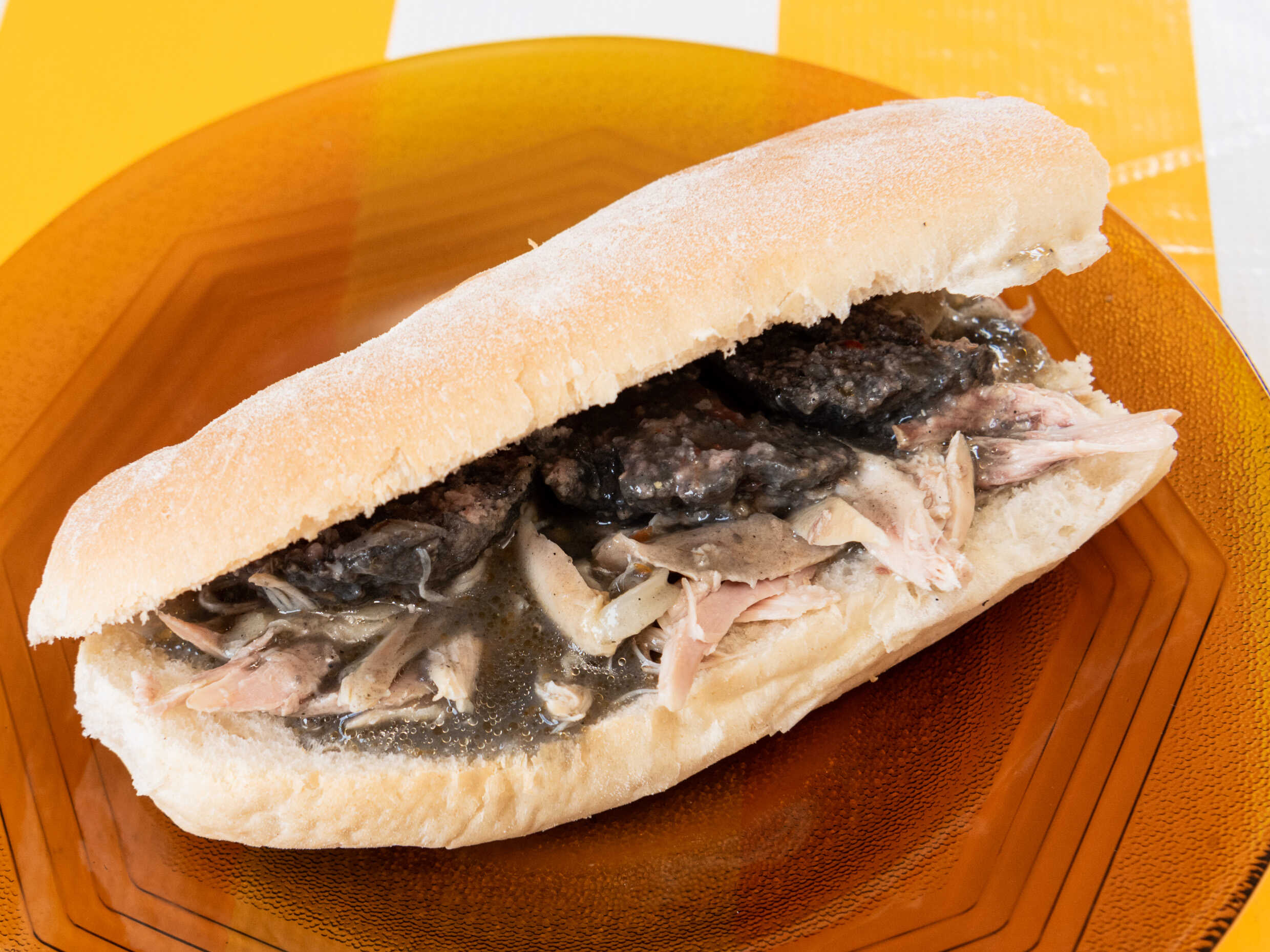 Pan francés, pollo, but, huevo, caldo de relleno.