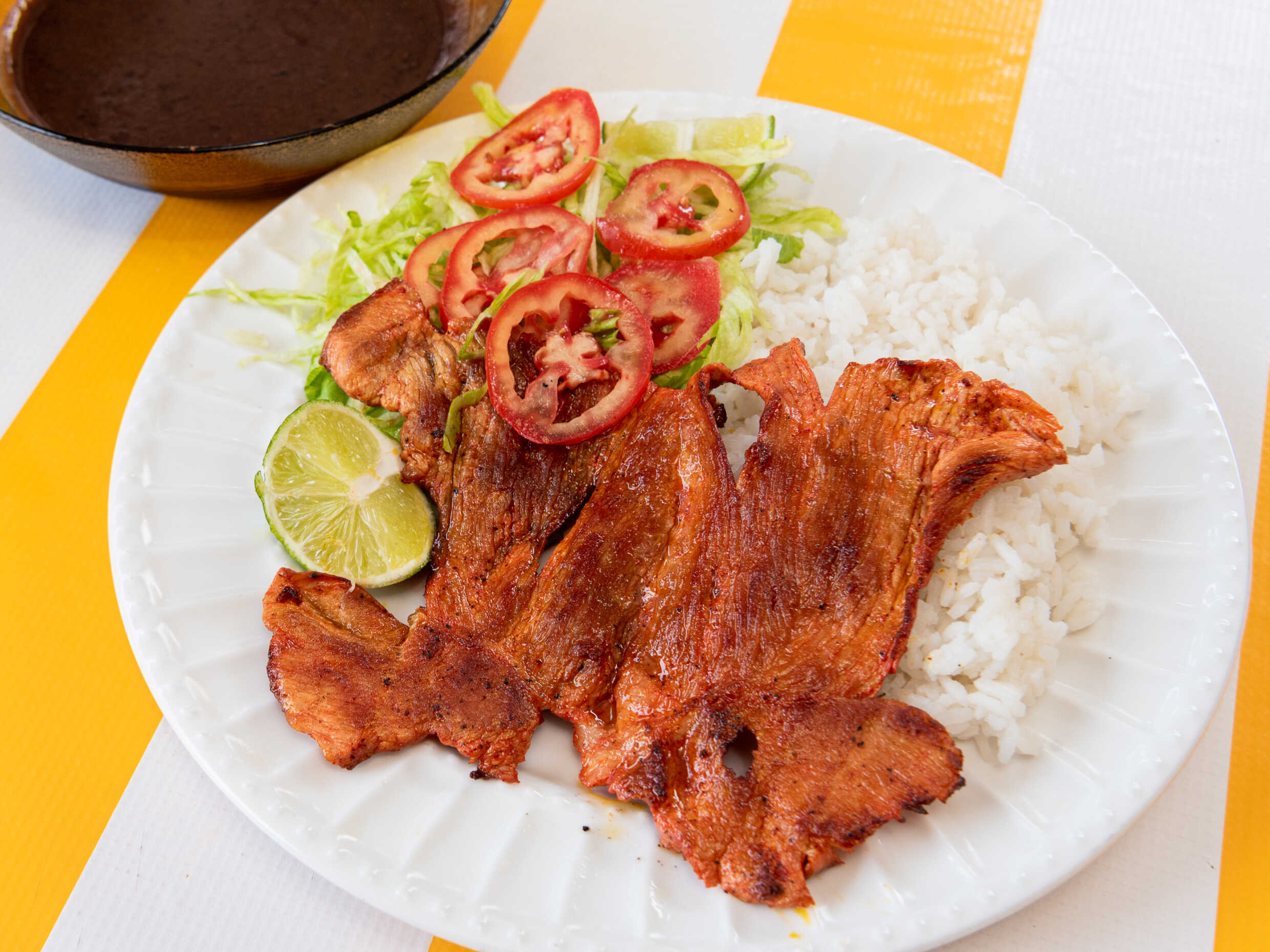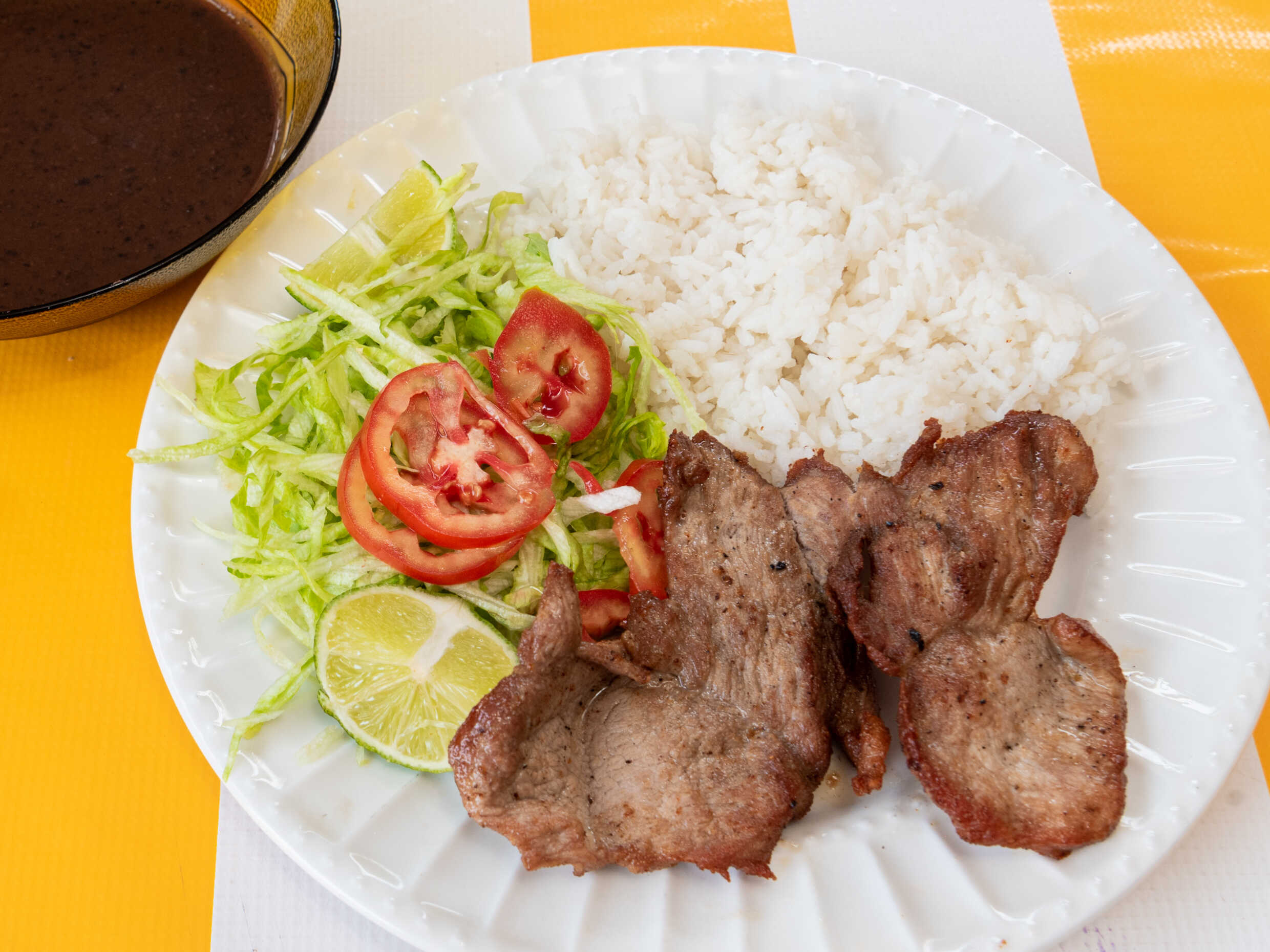 Ración de Poc Chuc (1 Persona) 120 gr de puerco frito, arroz, frijol y ensalada