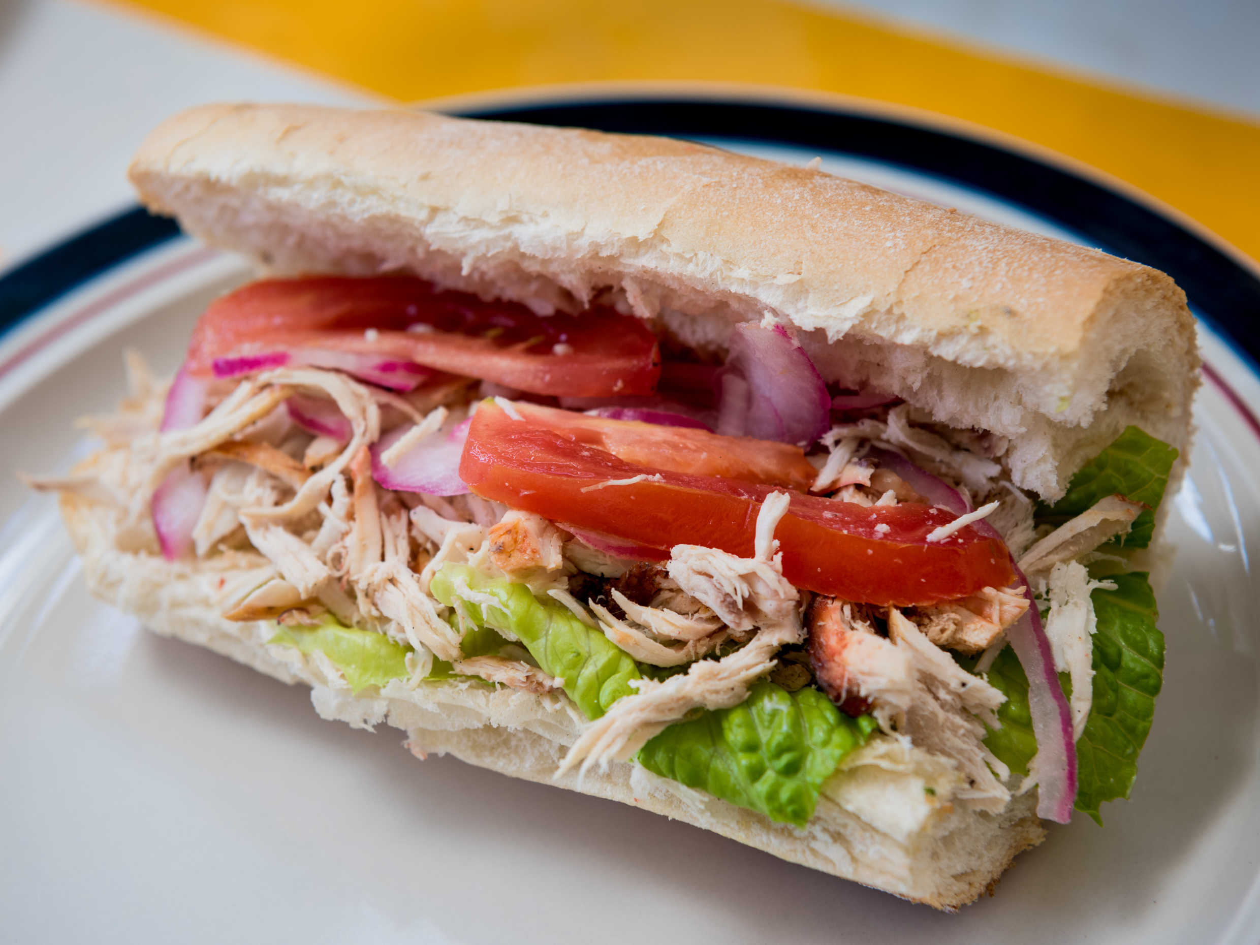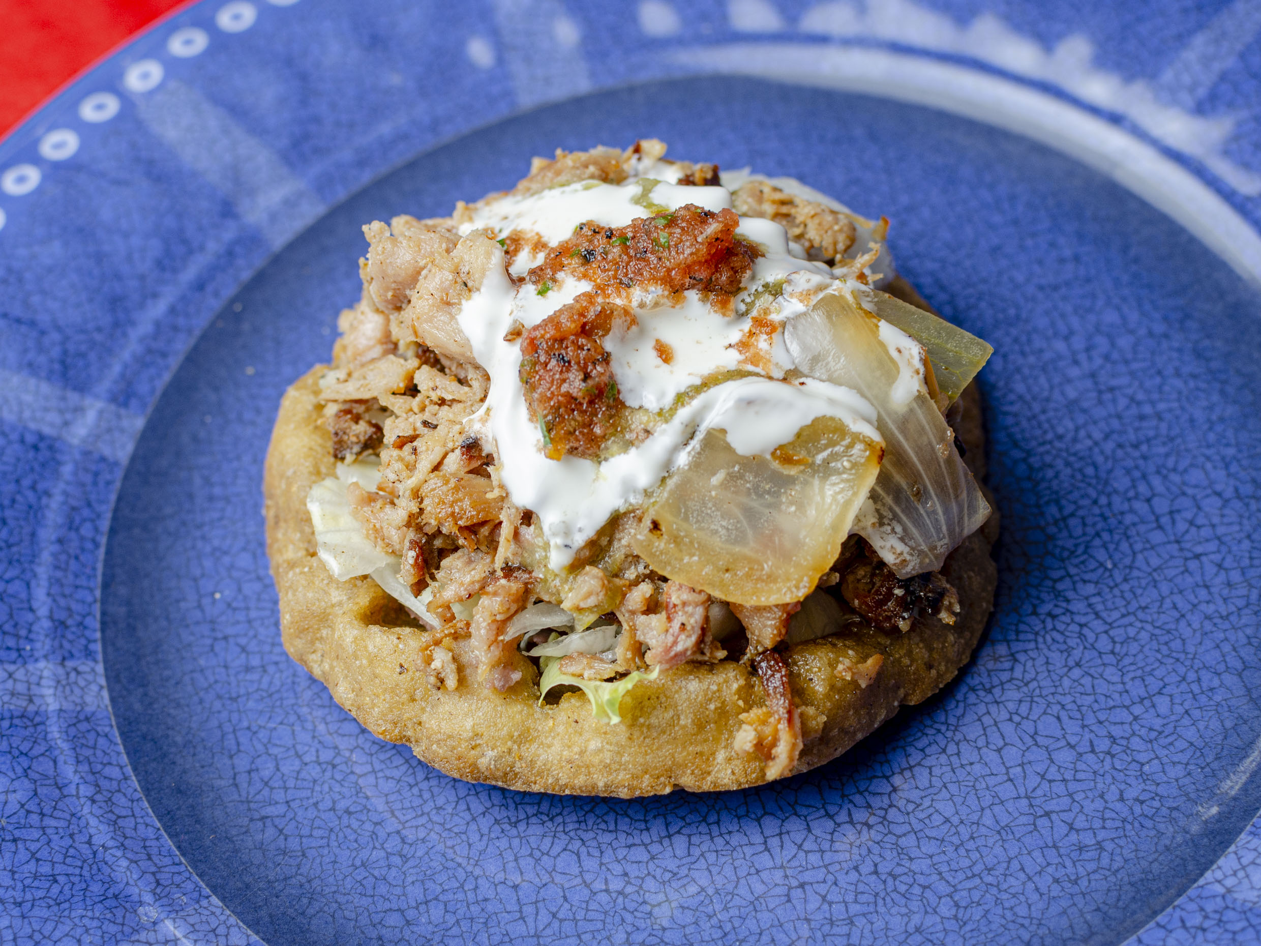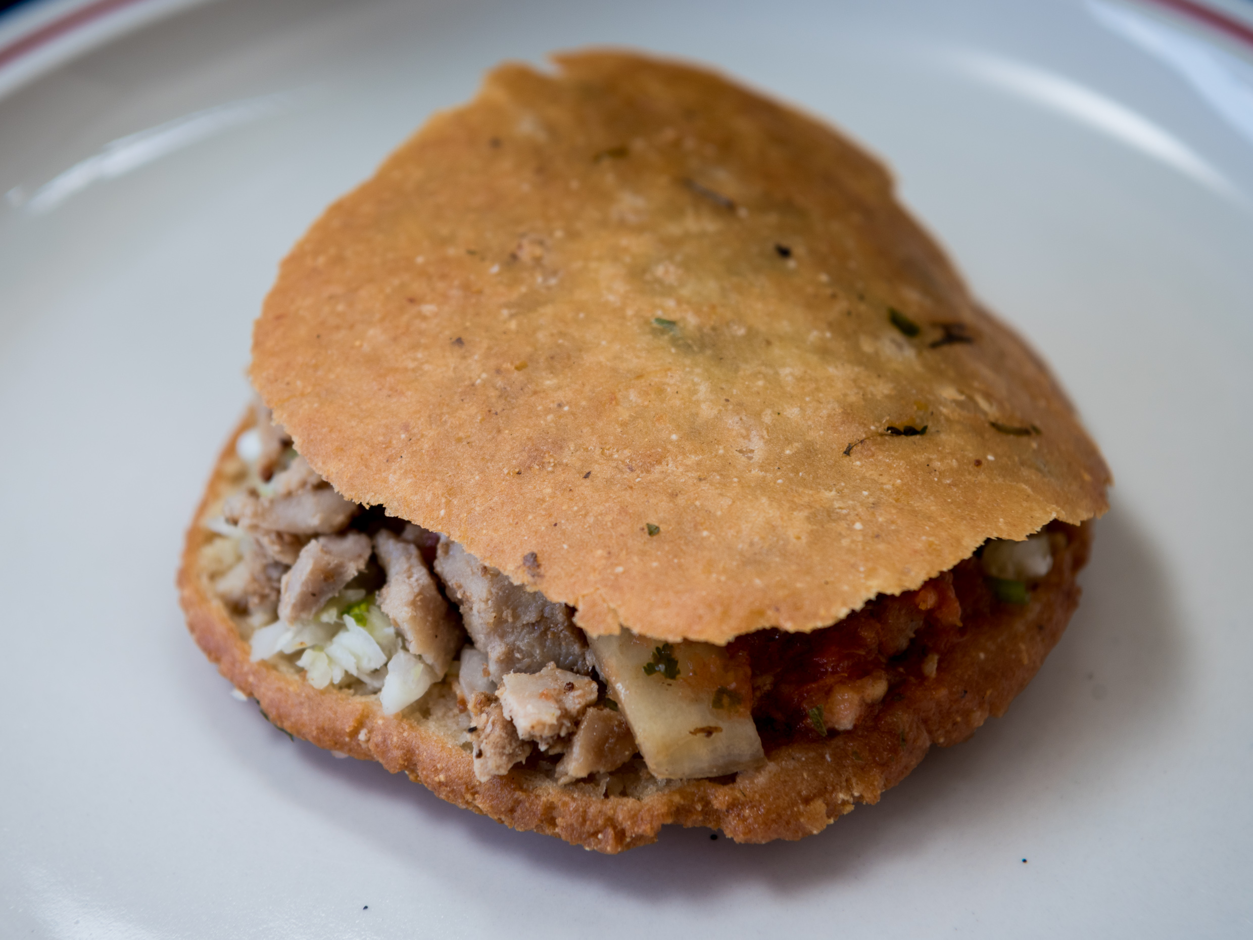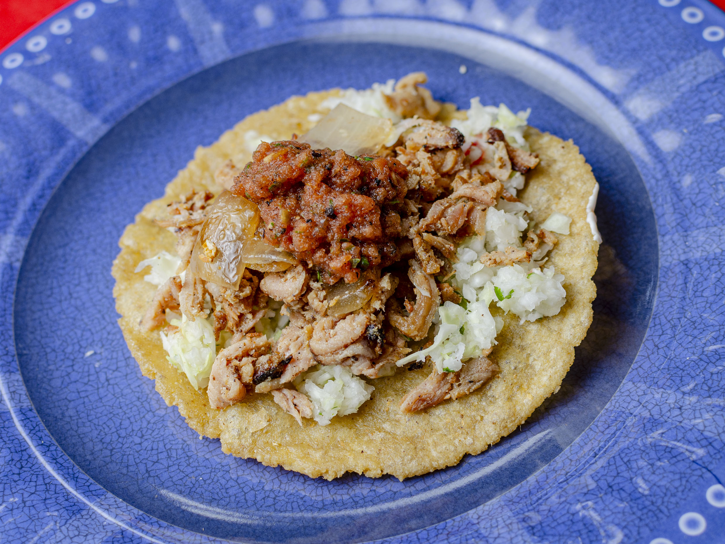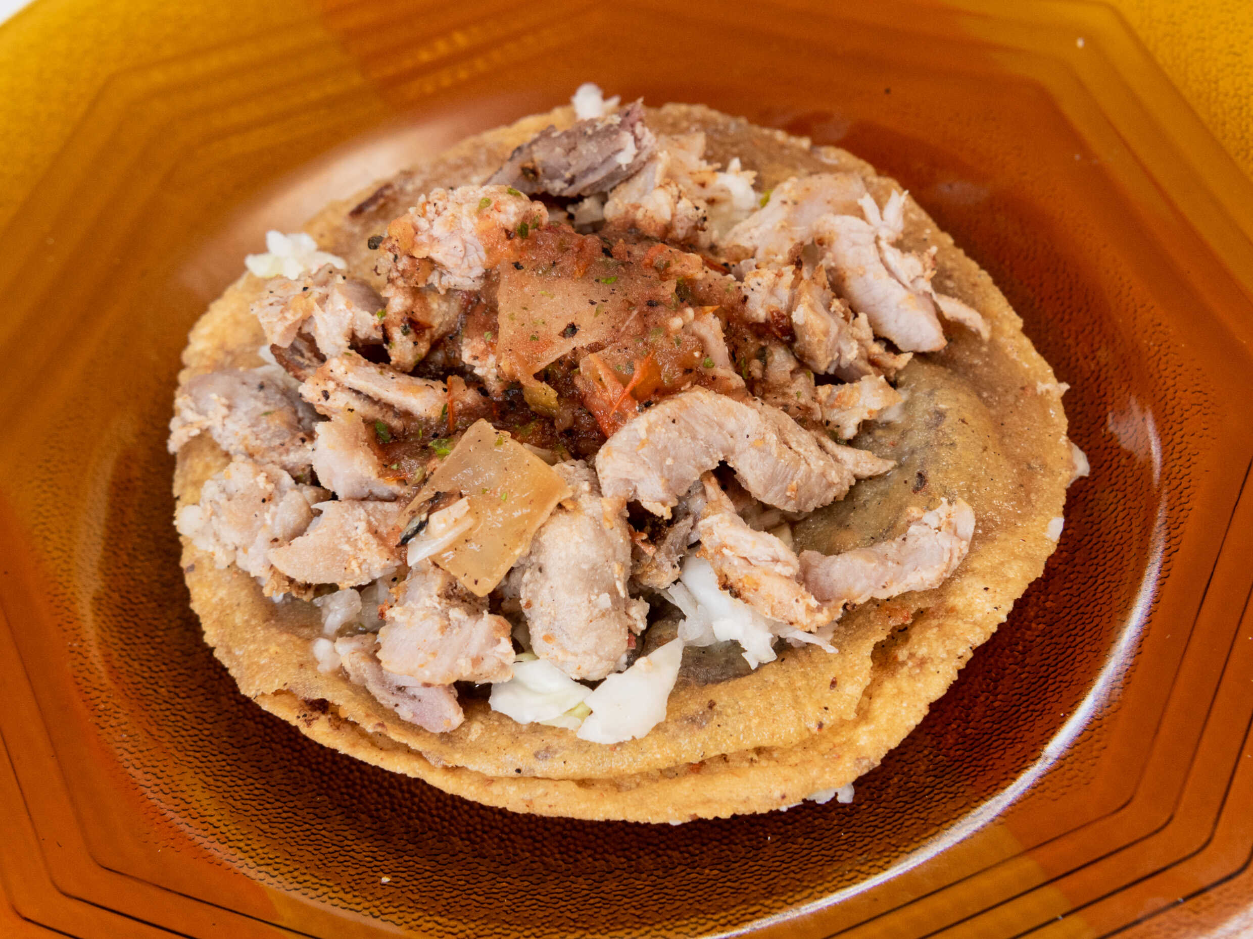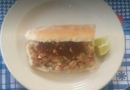 Pan francés, carne asada, repollo, frijol, chile, tomate, cebolla asada.