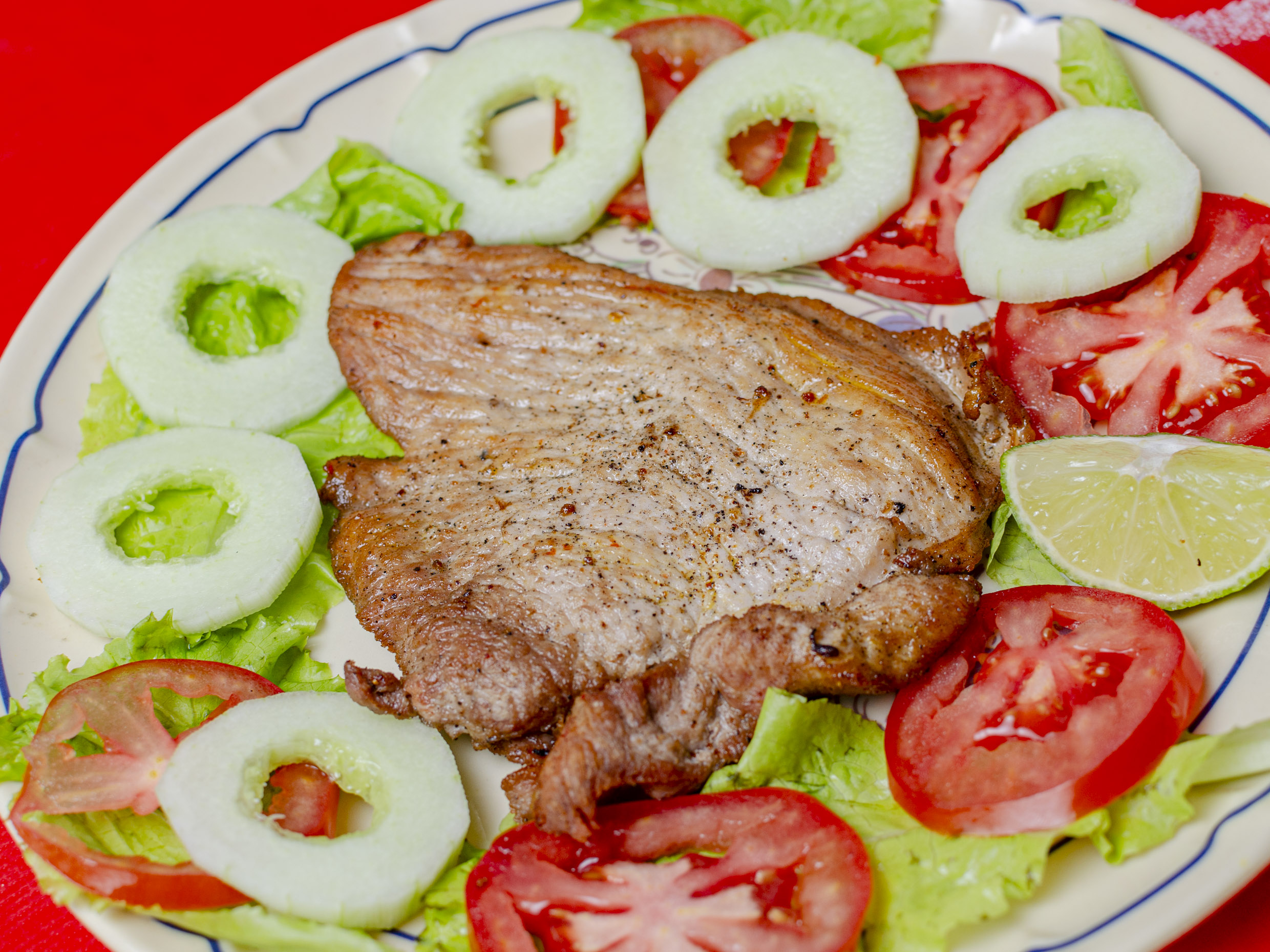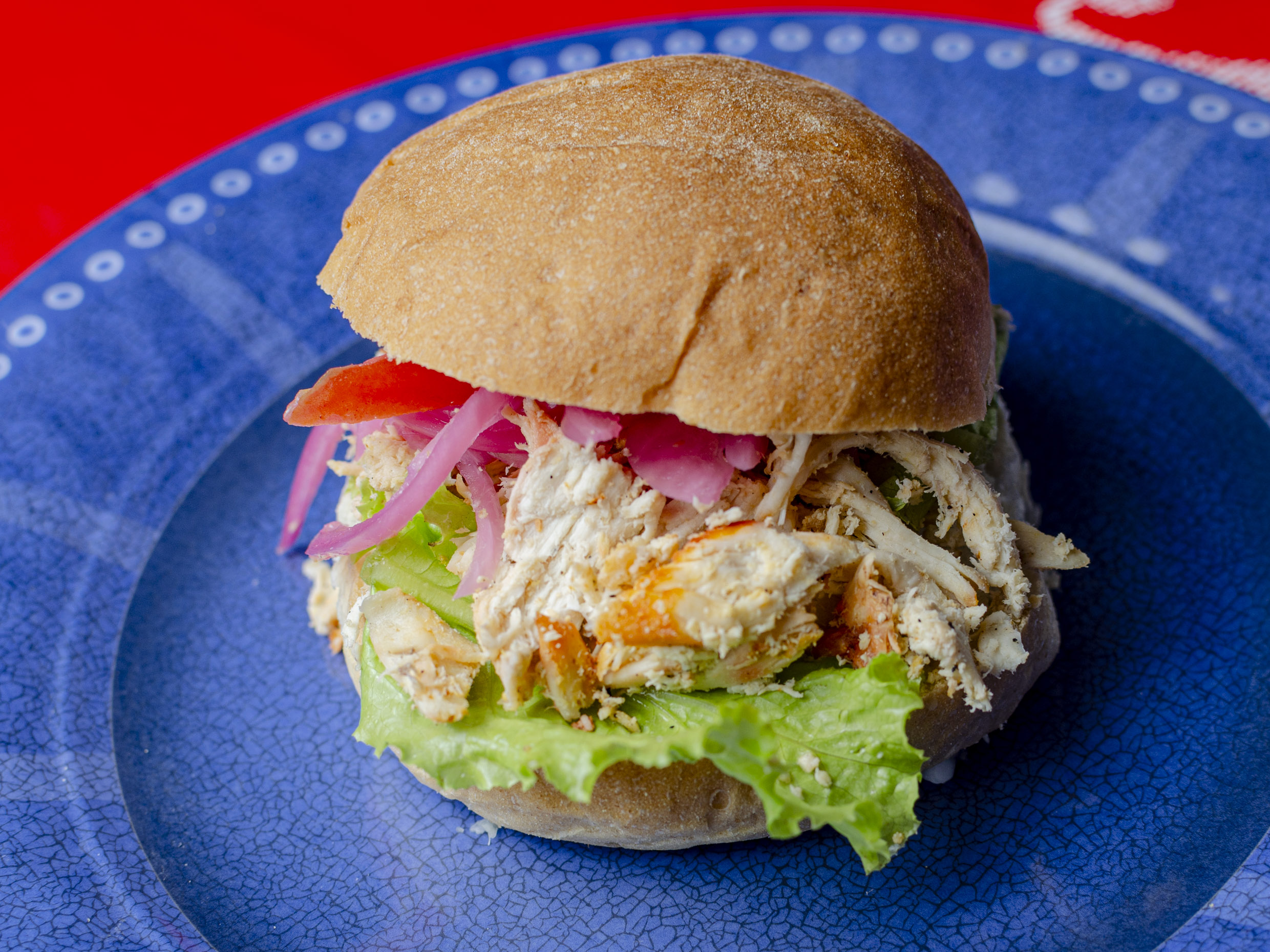 Pollo asado, romanita, cebolla roja, chile, tomate.