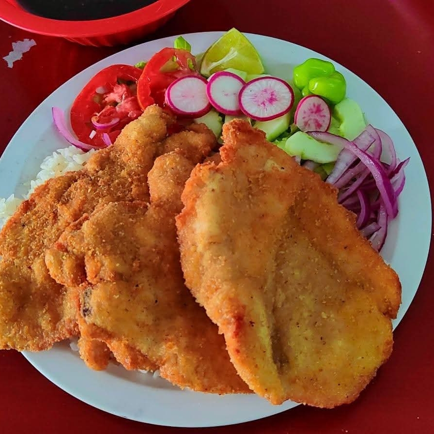 Pechuga empanizada acompañado de arroz, frijol, ensalada y tortillas. Para 1 persona