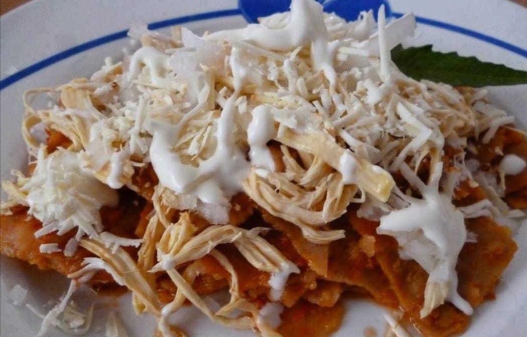120 grs. de totopos, con 2 huevos, queso fresco rallado, crema y cebolla.