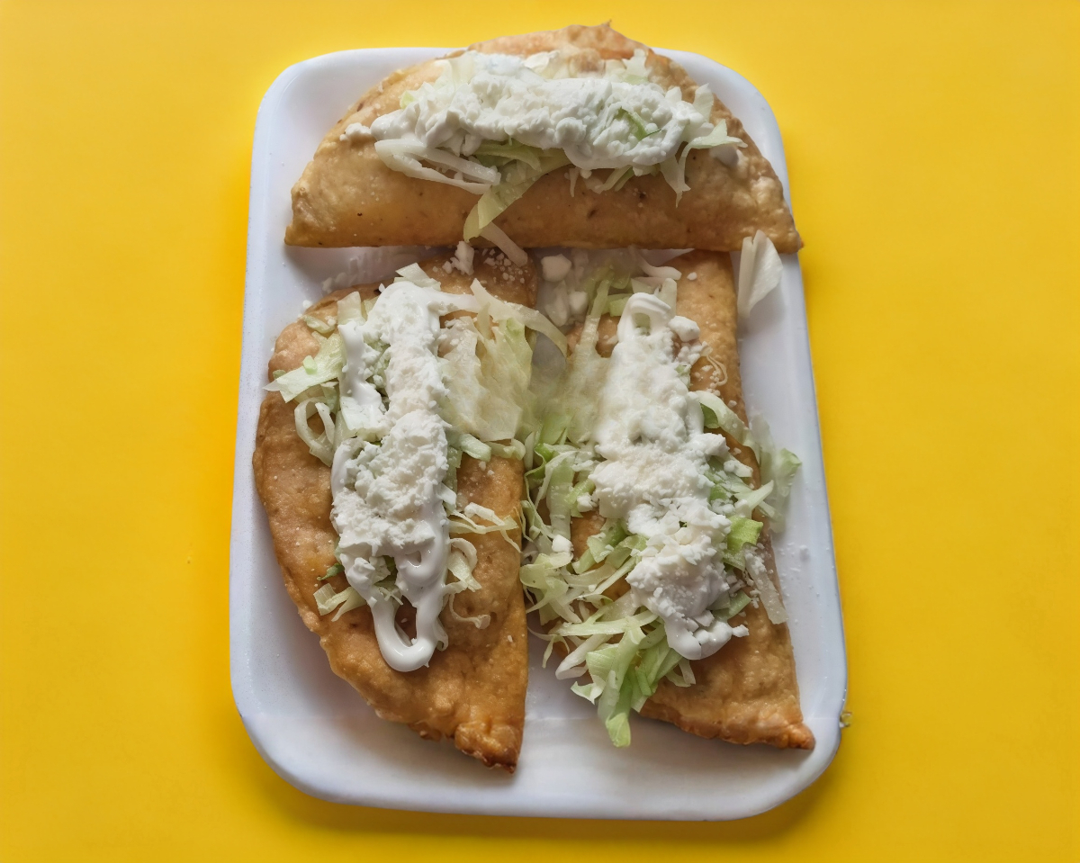 Una Empanada frita con queso de hebra con masa hecha a mano, lechuga ,queso sopero y crema