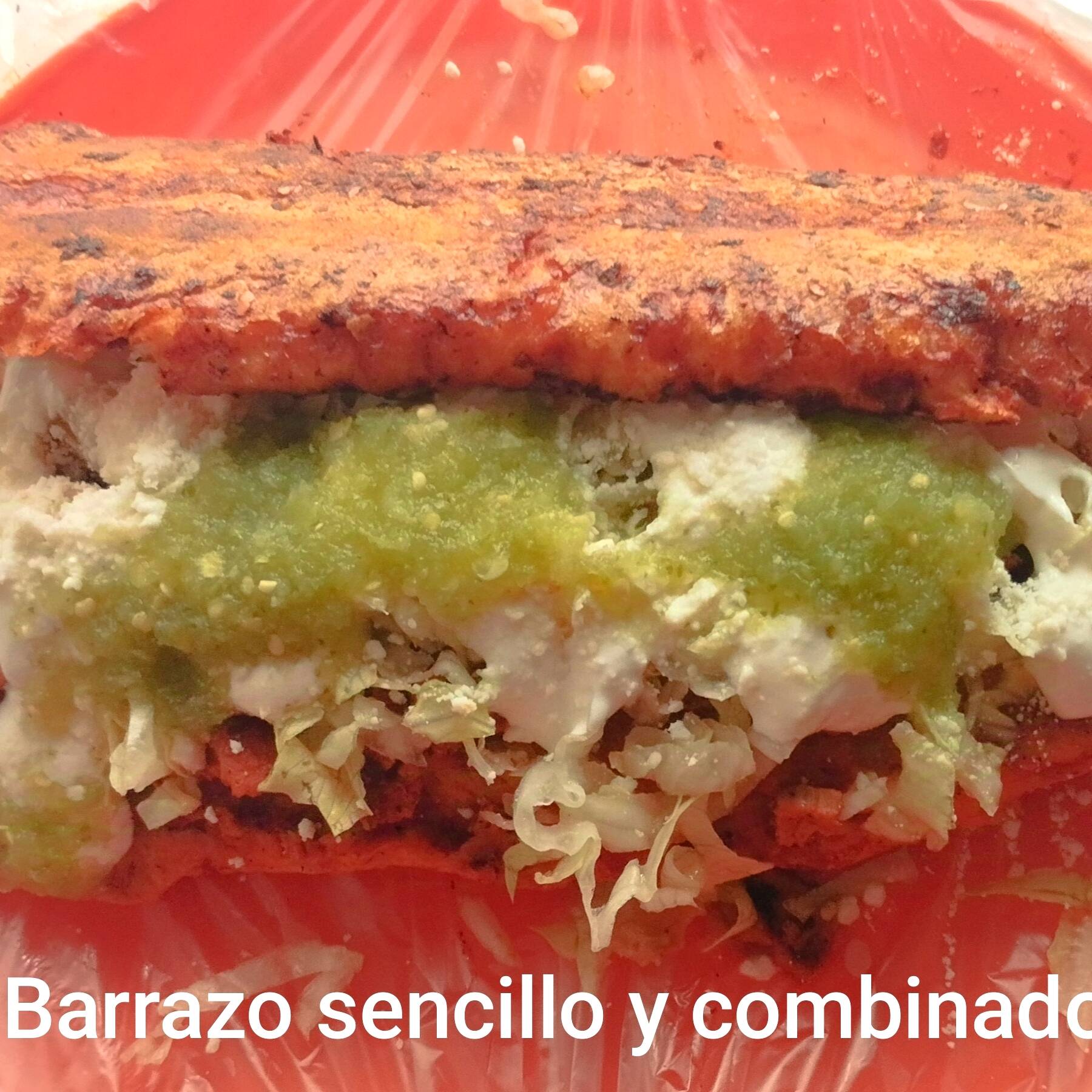 Una creación de la casa, combinando una torta de asado yucateca con un payaso de la celda ,es media barra rellena de papa con chorizo, asado,bñada en salsa roja doradita ala plancha y servida con queso,crema y lechuga