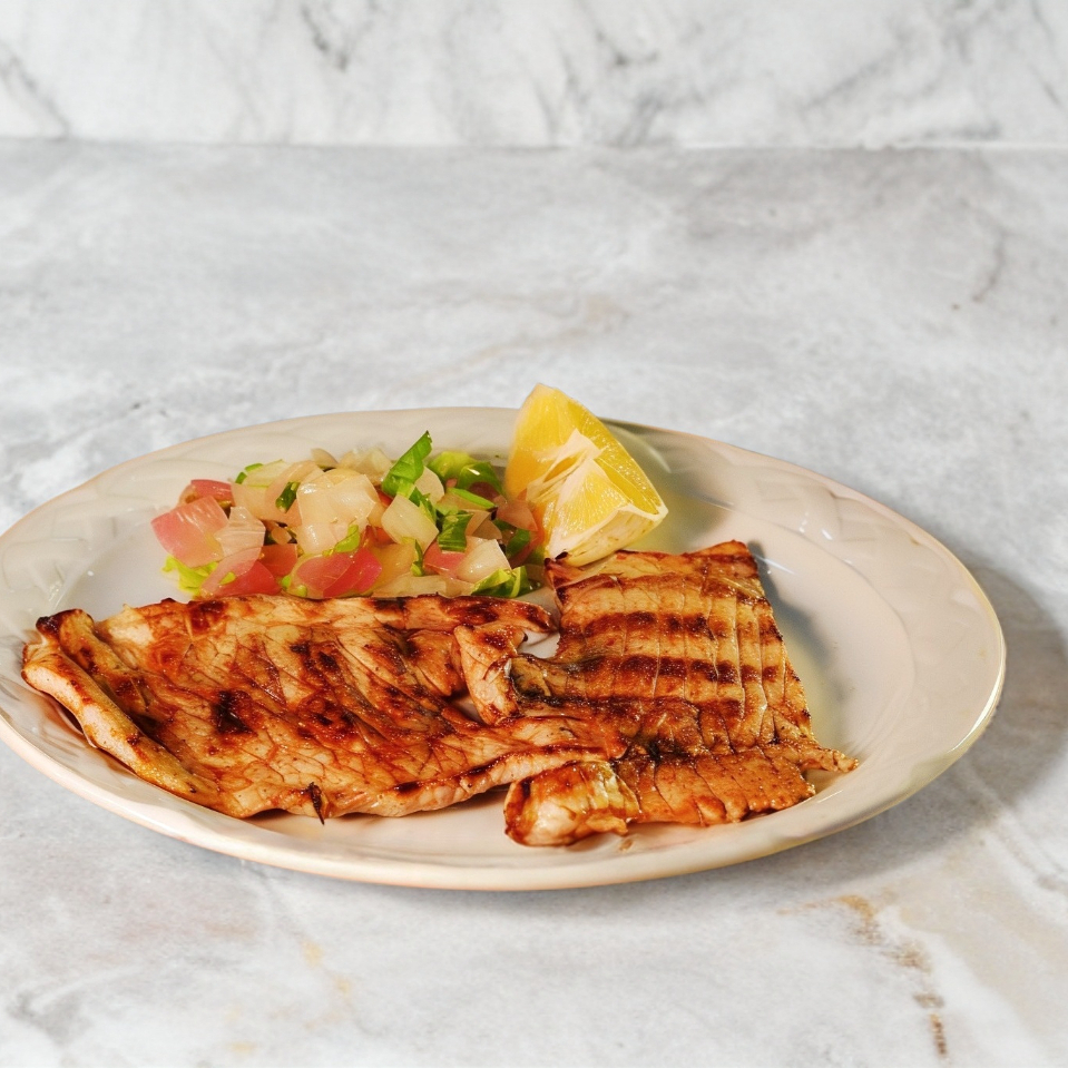 200gr Milanesa de puerco a la plancha acompañado de tortillas, salsa roja y cebolla y 2 guarniciones a elegir (arroz blanco, frijol colado, espagueti verde,espagueti rojo, pure de papa, platanos fritos o verduras al vapor).