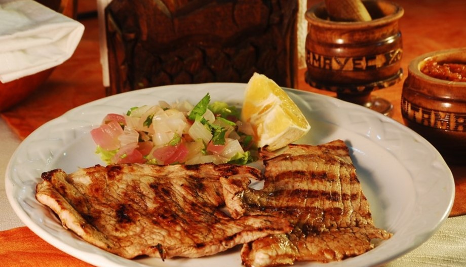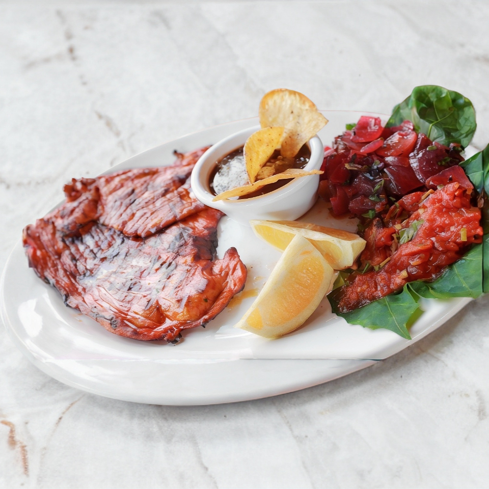 200gr Milanesa de puerco bañada en achiote al comal de tortillas, salsa roja y cebolla y 2 guarniciones a elegir (arroz blanco, frijol colado, espagueti verde, espagueti rojo, pure de papa, plátano frito o verduras al vapor).