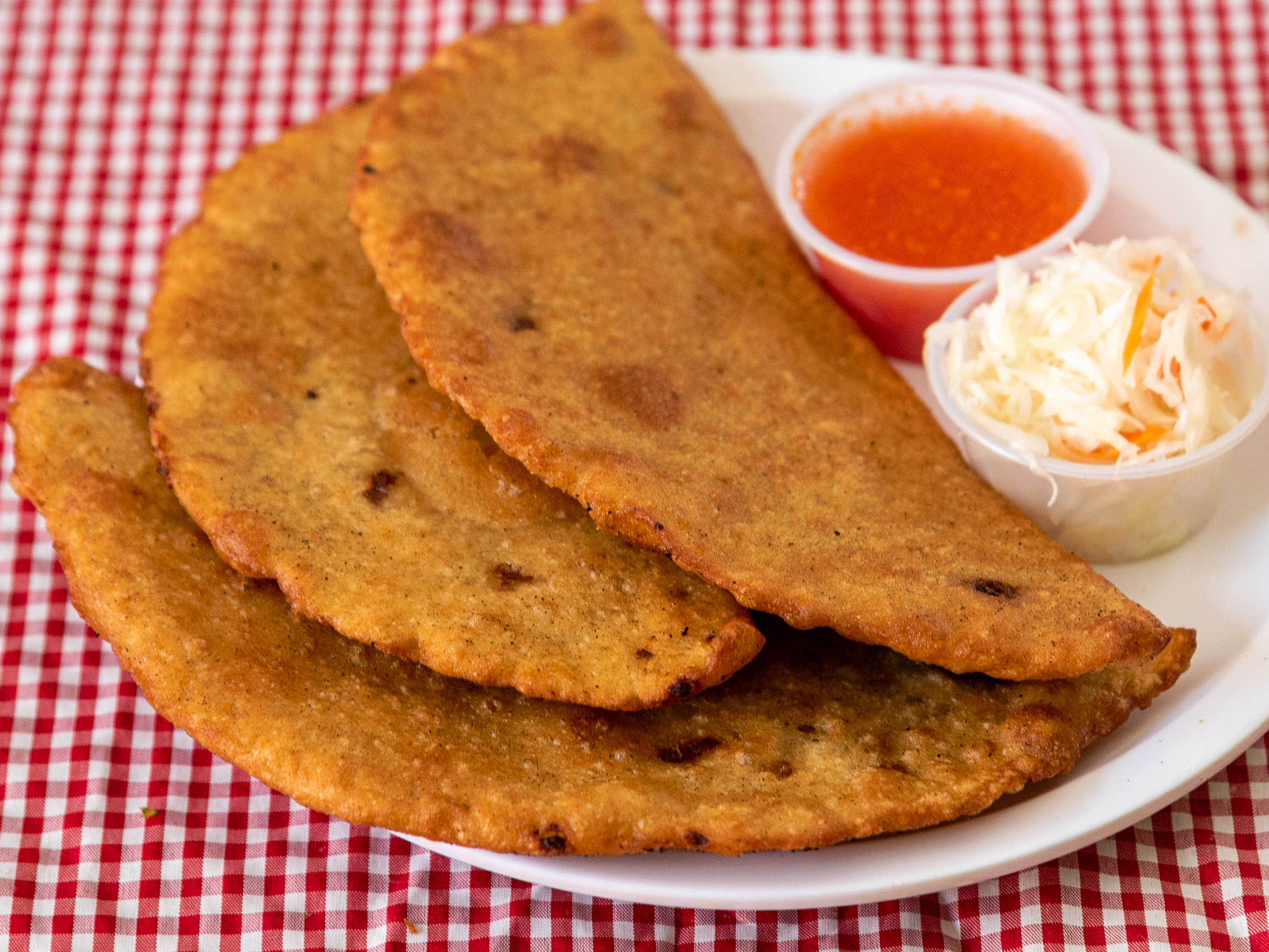 2 Piezas de empanadas rellenas de carne asada y queso, incluye col blanca y salsa de tomate.