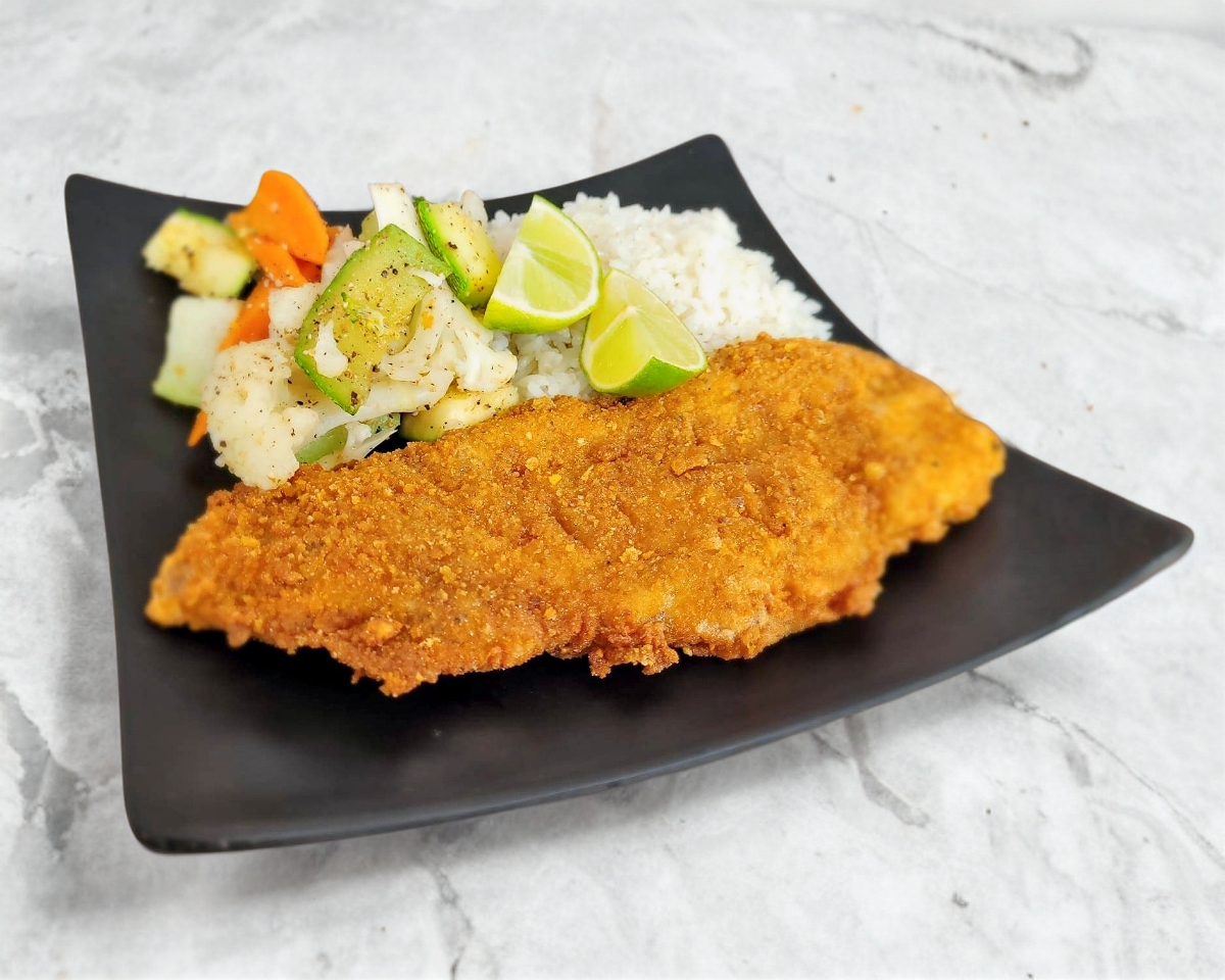 ¡Crujiente por fuera, jugosita por dentro! Pechuga de pollo empanizada con pan molido sazonado y especias de la casa, frita al momento para lograr esa textura dorada irresistible 🤤 El platillo incluye 100 g de milanesa cocida y puedes escoger entre nuestras guarniciones: arroz, frijol refrito, ensalada fresca o tortillas. 📏 Tamaño total: Media orden 250 g | Orden completa 450 g 🔥 Calorías