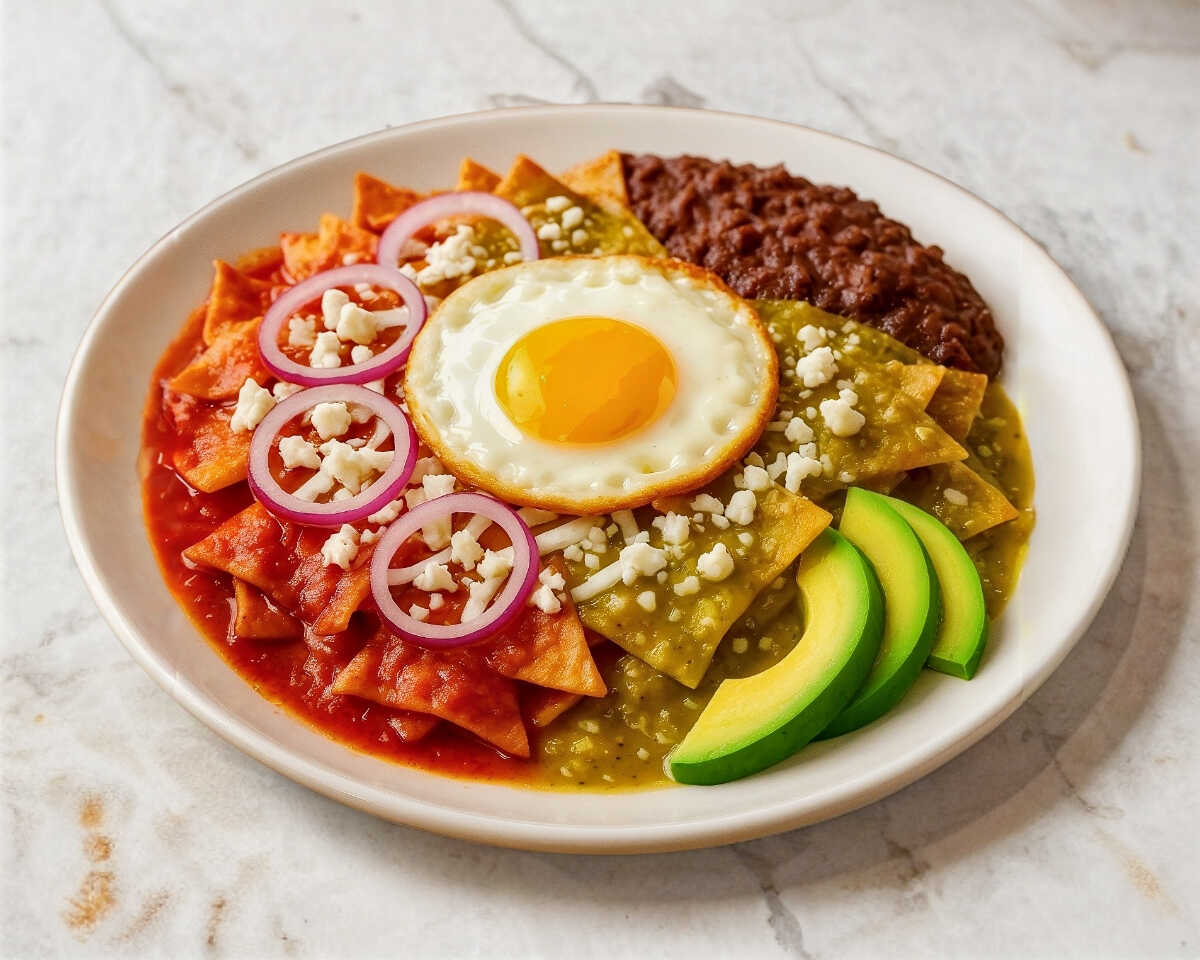 Totopos de maíz bañados en tu salsa favorita (roja 🌶️, verde 🌿 o divorciada ❤️💚), coronados con crema fresca, queso rallado y cebolla morada. Acompañados con frijoles refritos. Porción: 150 g de totopos + 100 g de salsa + toppings.