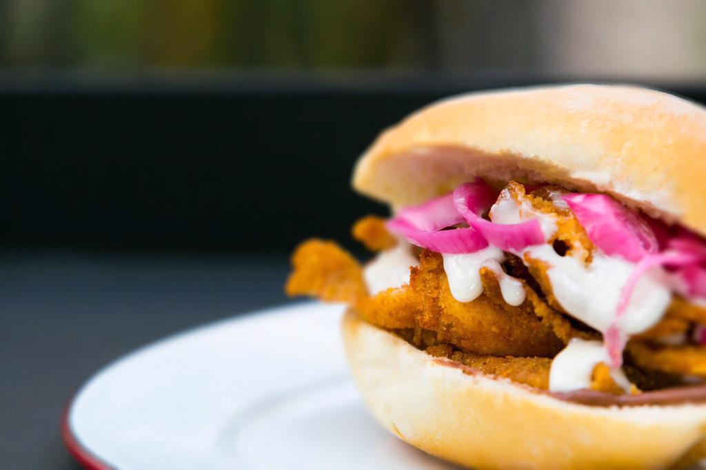 Bolillo con camarones empanizados, romanita, frijol, salsa aurora, pico de gallo y cebolla morada.