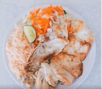 Filete de pechuga de pollo con guarnición de arroz, cebolla asada, frijol colado, ensalada de repollo con zanahoria, limón, tortillas y salsa habanero.
