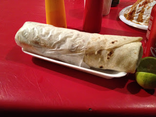 Tortilla de harina de 30 cm, queso gouda, cebolla asada y frijol, acompañada de arroz, ensalada y salsas.