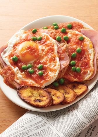 Como base tortilla frita con frijoles refritos y encima un huevo frito/estrellado, a lo que se le agrega una salsa preparada con tomates, jamón en cubos y chícharos.