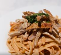 Espagueti con salsa Alfredo, tiras de pollo y pan.
