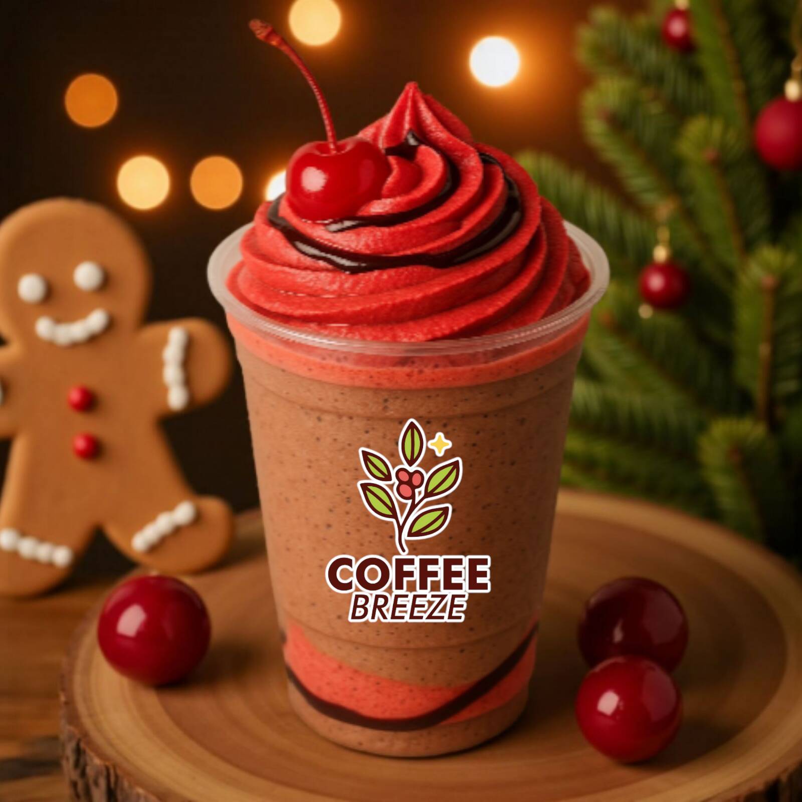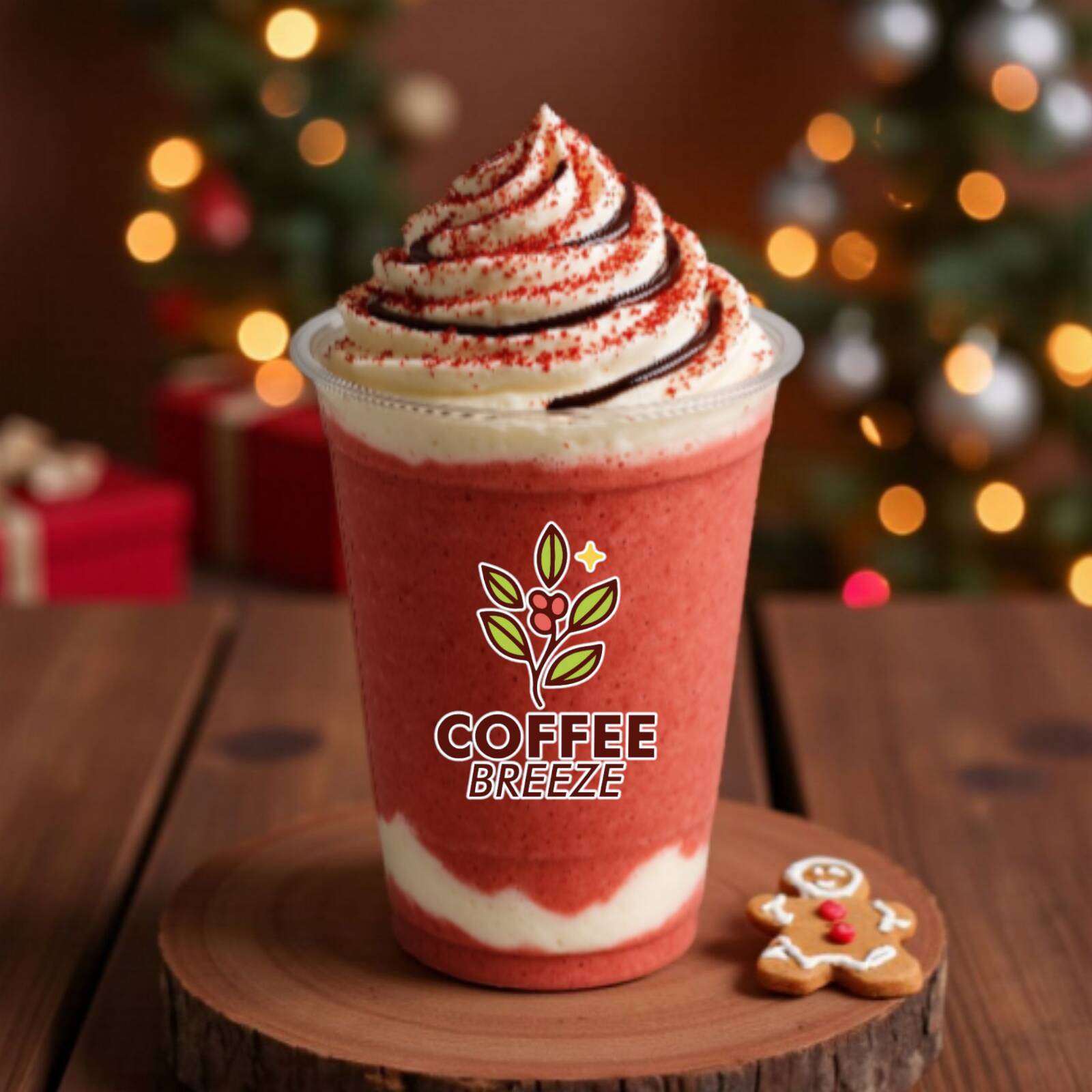 Delicioso frappe sabor red velvet con cafe, cubierto con crema batida, topping Red Velvet y salsa de chocolate.