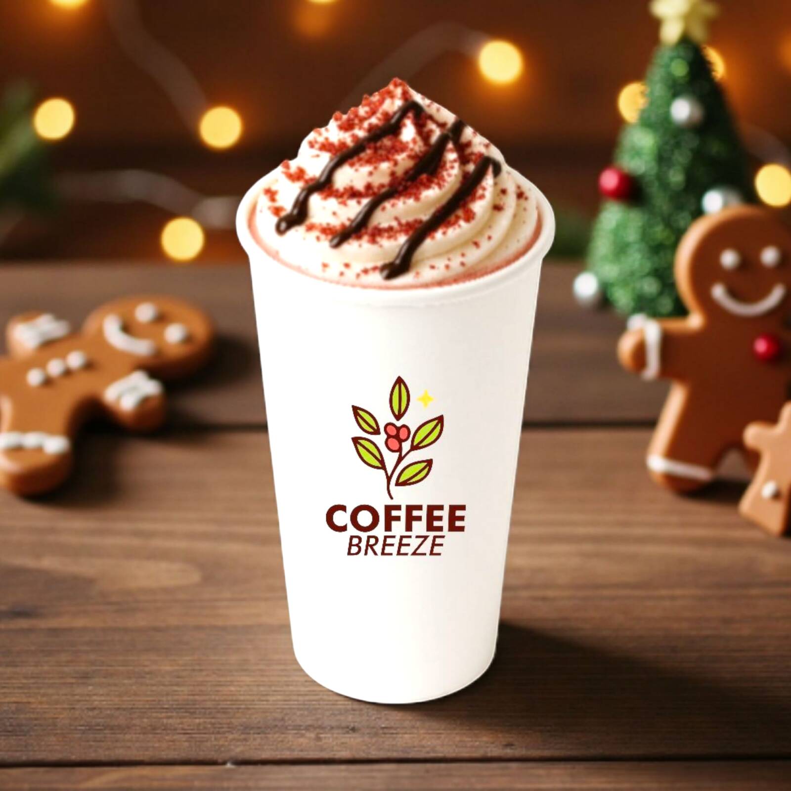 Bebida Caliente con Café y Nuestra base Red Velvet, Cubierta con crema batida, topping Red Velvet y salsa de chocolate.