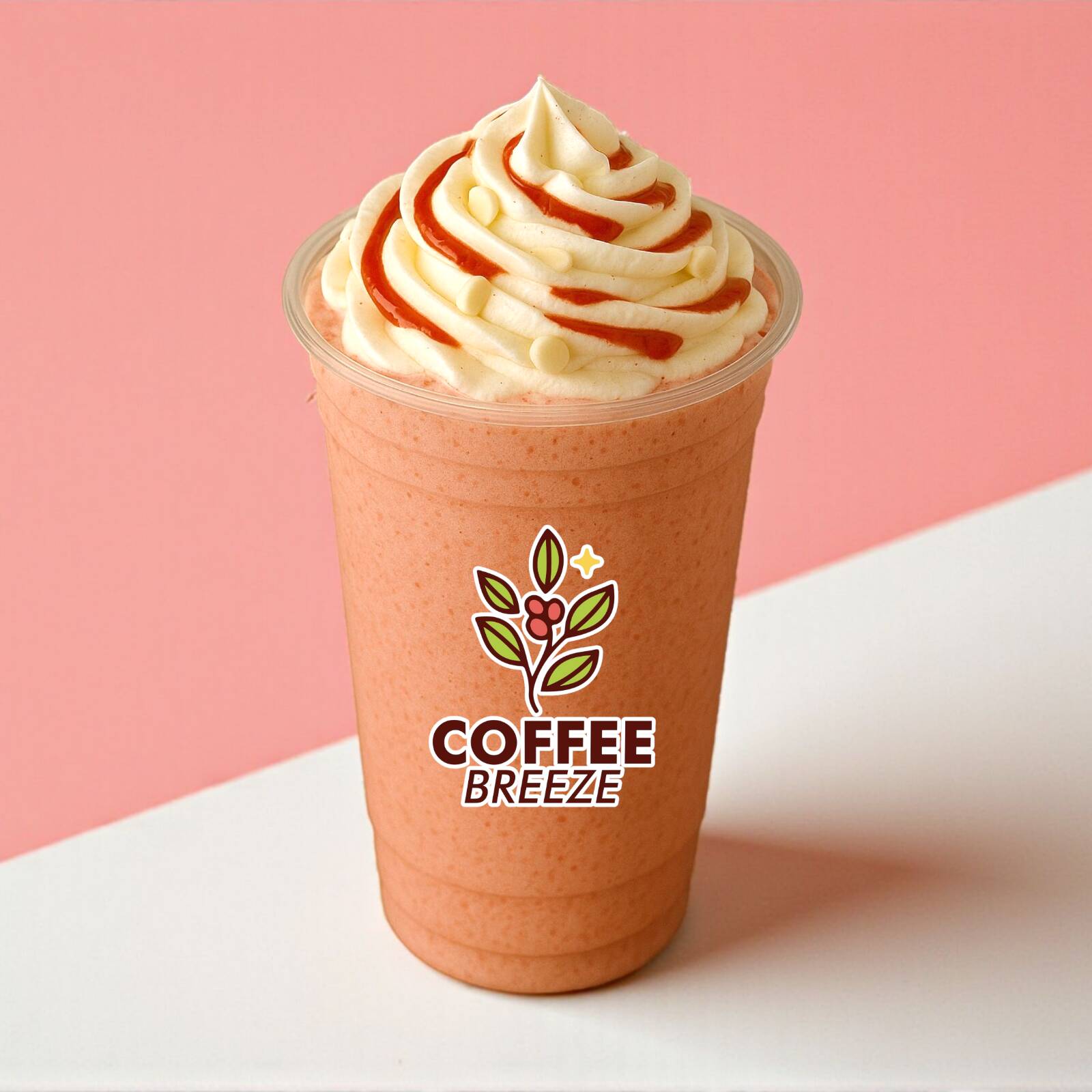 Delicioso Frappe Sabor Fresas con Crema con topping de crema batida, salsa de fresa y chocolate blanco.