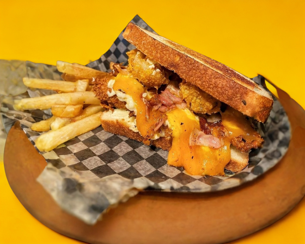 Hecho con pan de mantequilla, con costra de queso cheddar por fuera y queso mozzarella por dentro, acompañado de papas a la francesa.