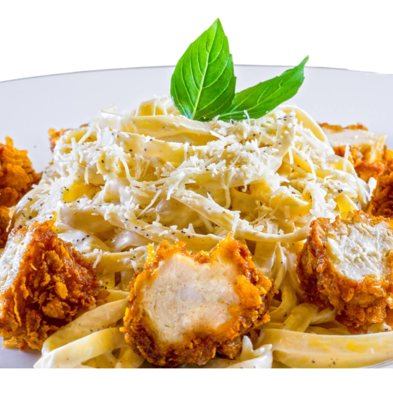 Fetuccini Alfredo cremoso con un toque de Blue Cheese y tiras de pollo empanizado.