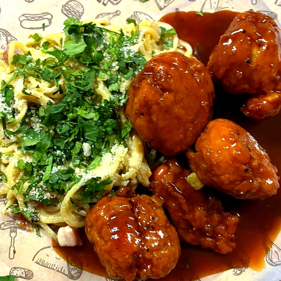 Pasta CARBONADA CON 6 PIEZAS DE BONELES BBQ BAÑADAS