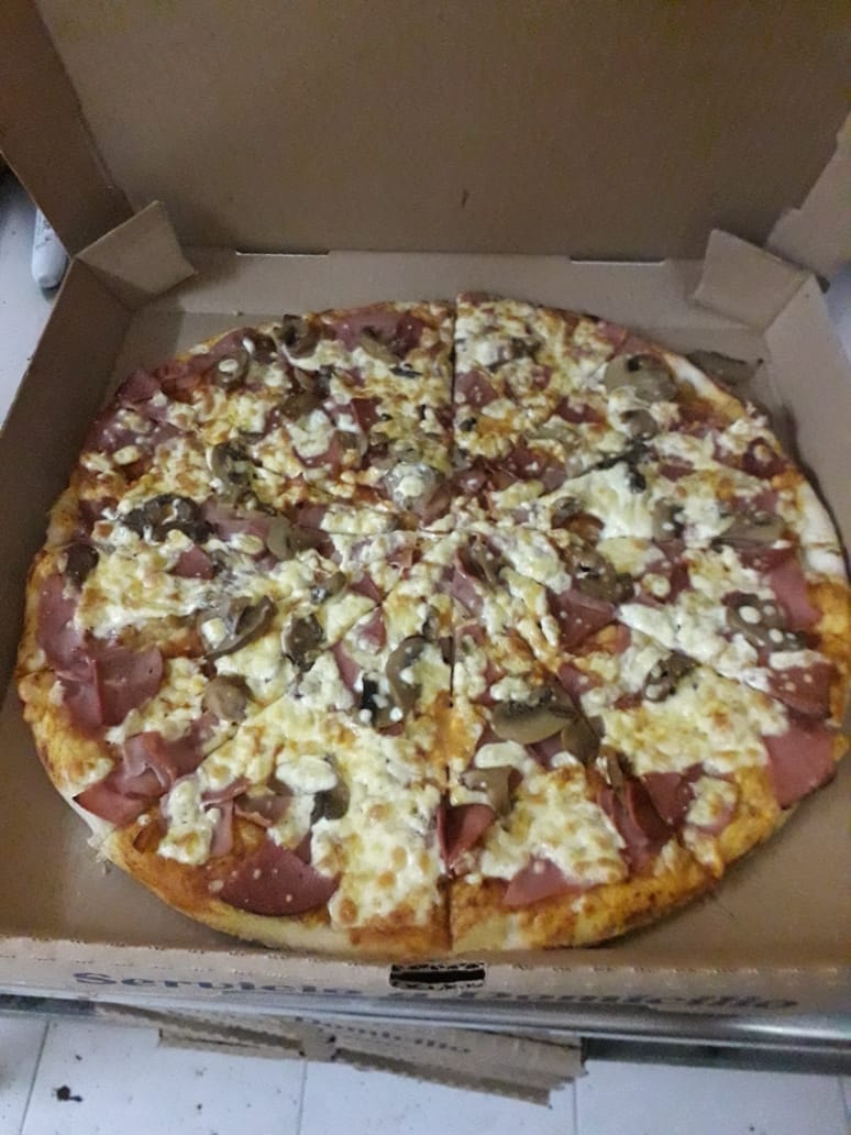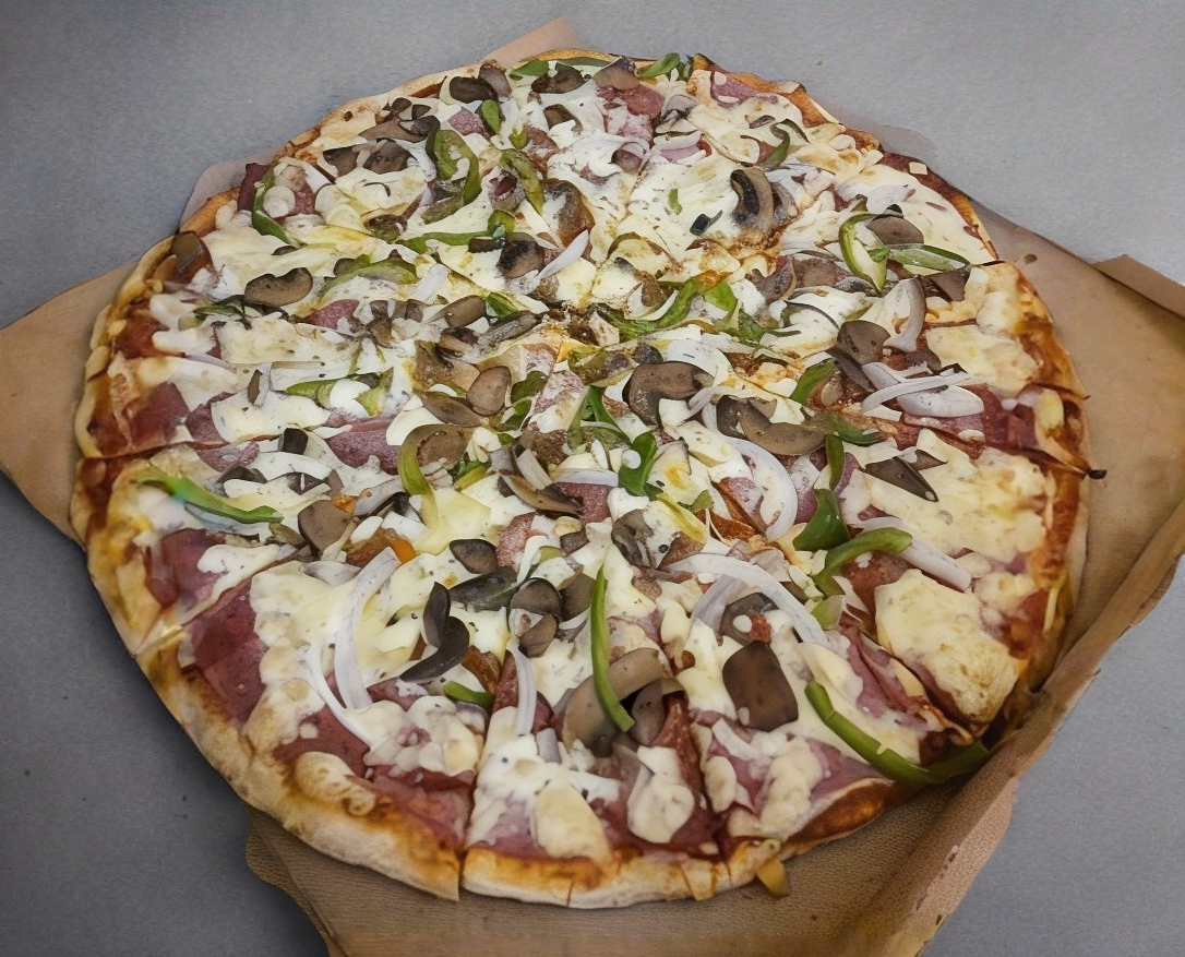 Pizzs grande Jamón salami champiñón pimiento cebolla tocino chorizo