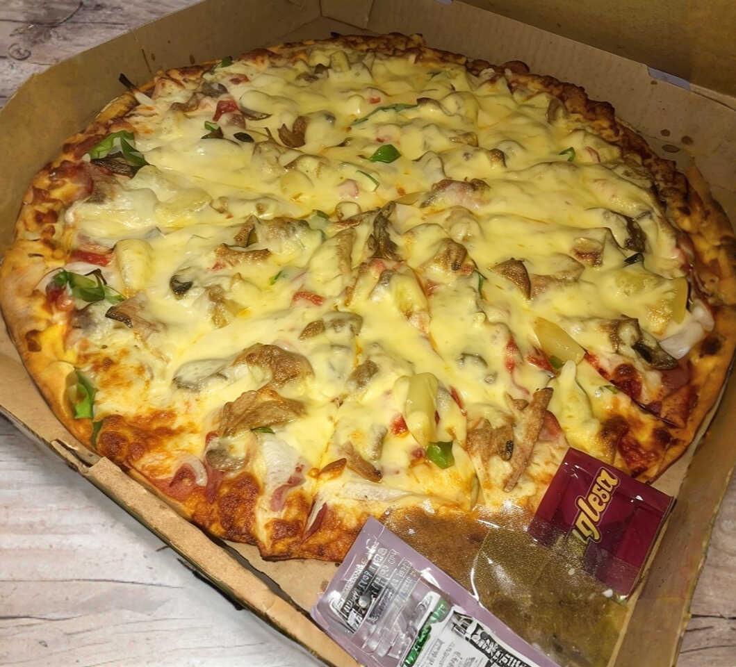 Jamón salami champiñones pimiento cebolla, más triple queso