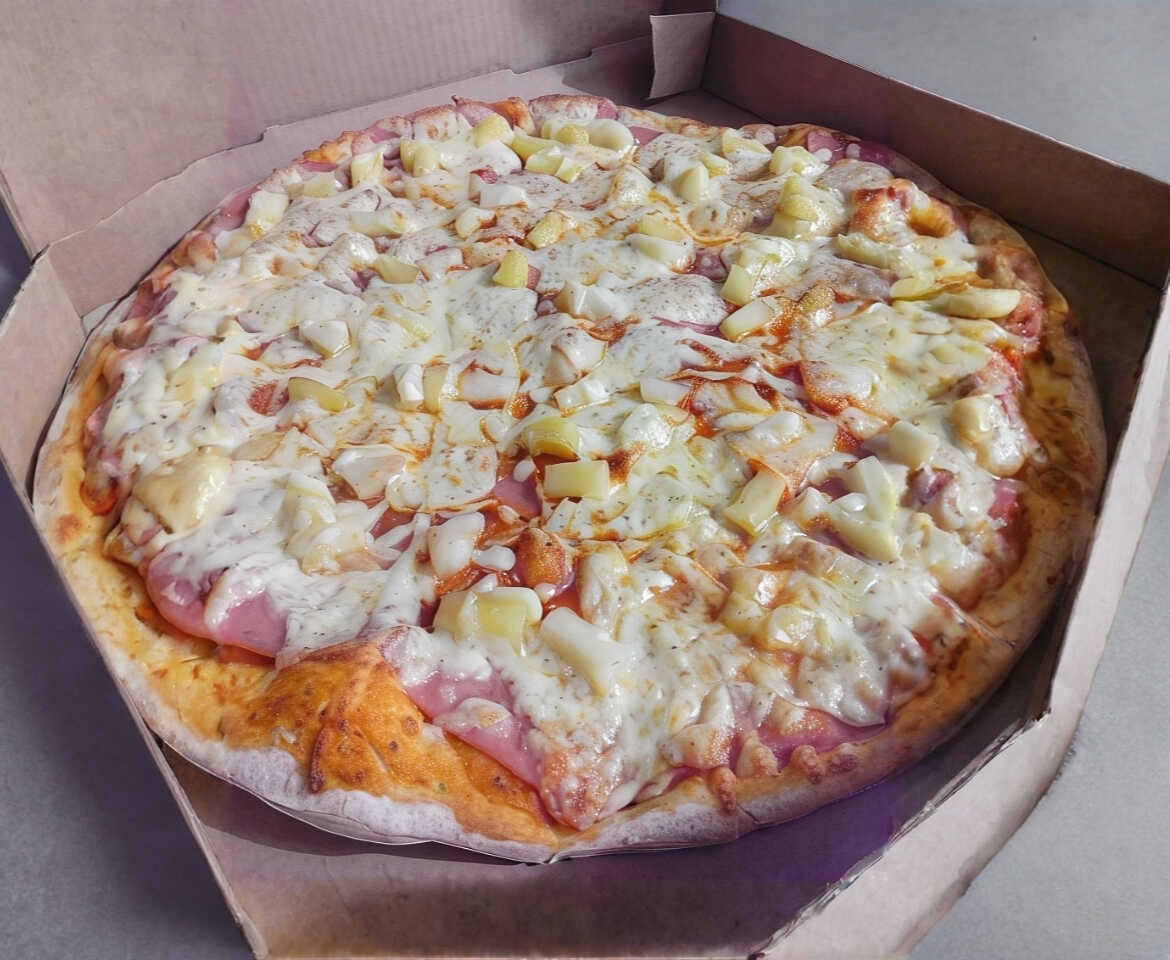 Pizza grande Jamón salami tocino chorizo pimiento cebolla piña pierna