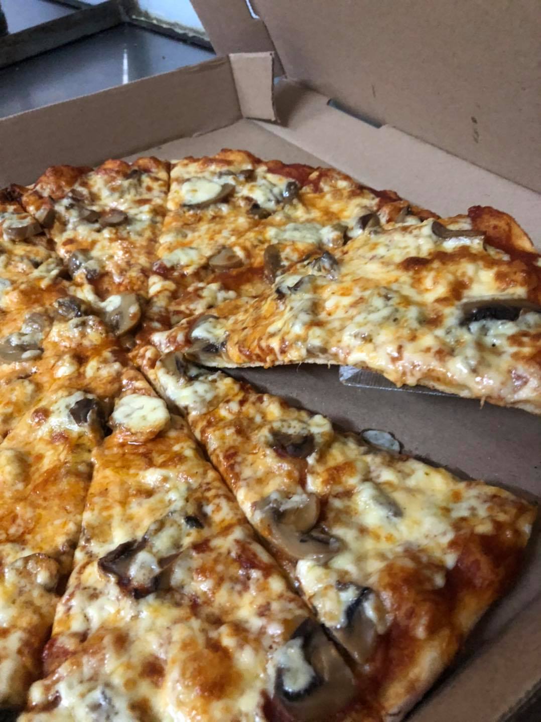 Pizza grande Pimiento cebolla salchicha tocino aceite de ajo