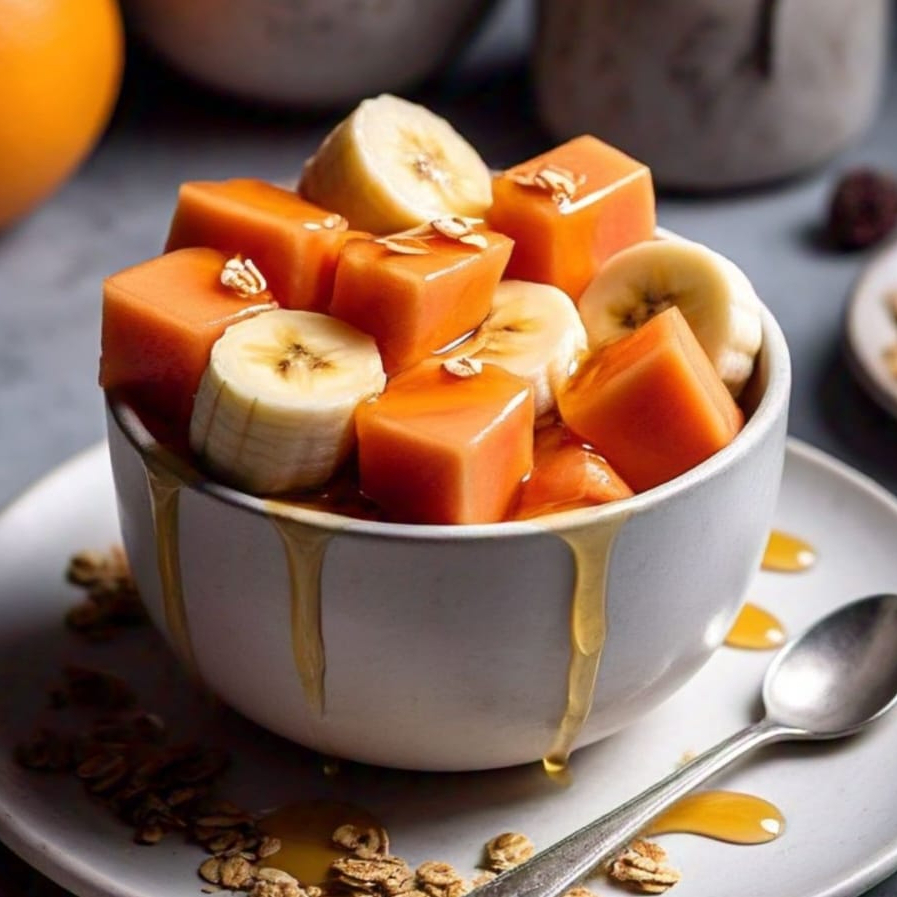 Melón, papaya, sandia, manzana y plátano, aderezados con yogurt, miel y granola.