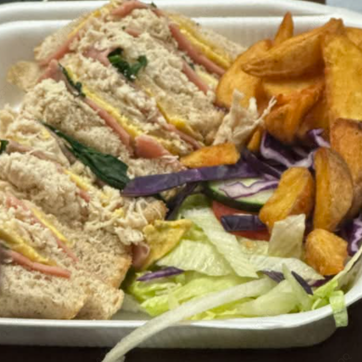 Jamón de pavo, queso manchego, pollo, huevo, espinaca, tomate, romanita, pepino, acompañado de papas a la francesa.