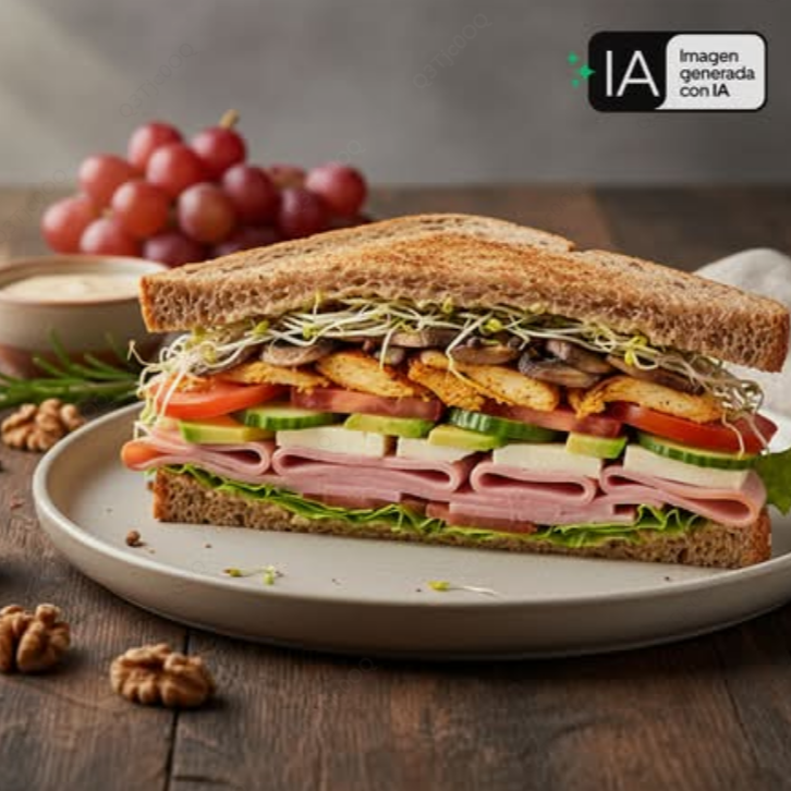 Jamón de pavo, queso manchego, queso panela, pollo, champiñones, germinados de alfalfa, aguacate, pepino, tomate y lechuga romana.