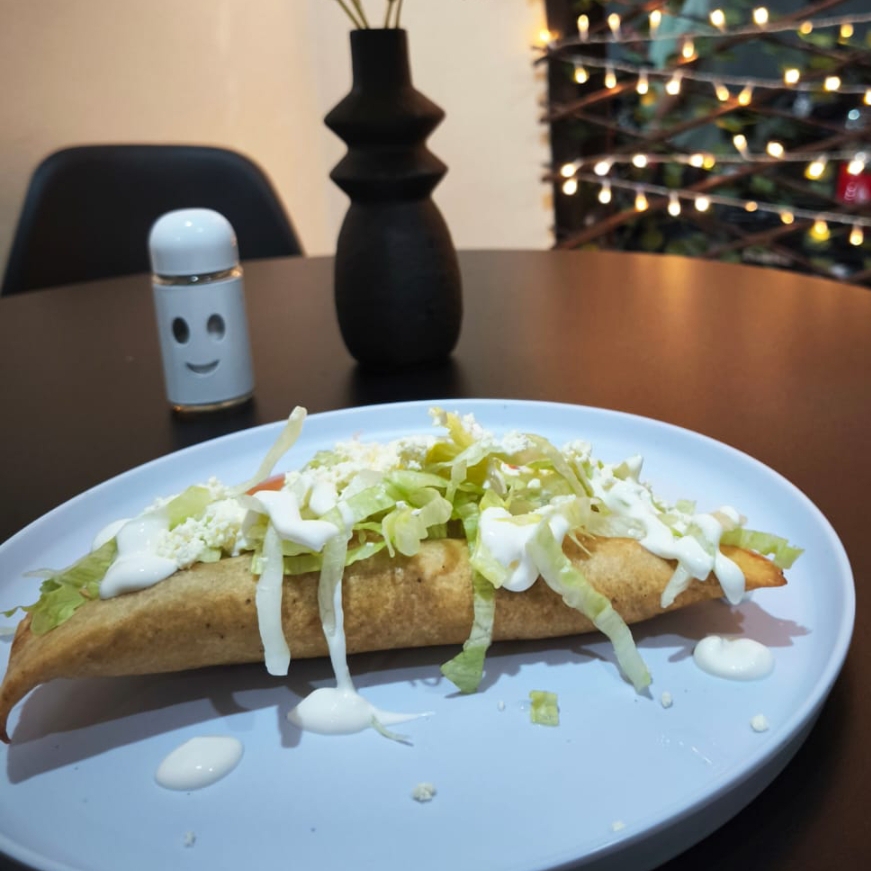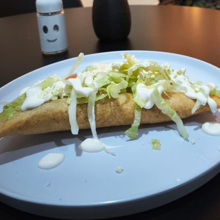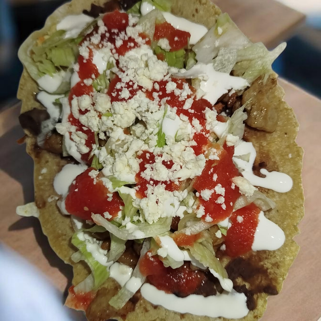 Huarache con queso de hebra en la masa, con base de frijol, carne asada, lechuga, media crema, salsa de tomate y queso espolvoreado