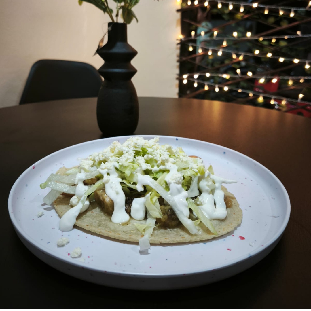Sope de Asado acompañado de frijol, carne asada, lechuga, media crema, salsa de tomate y queso