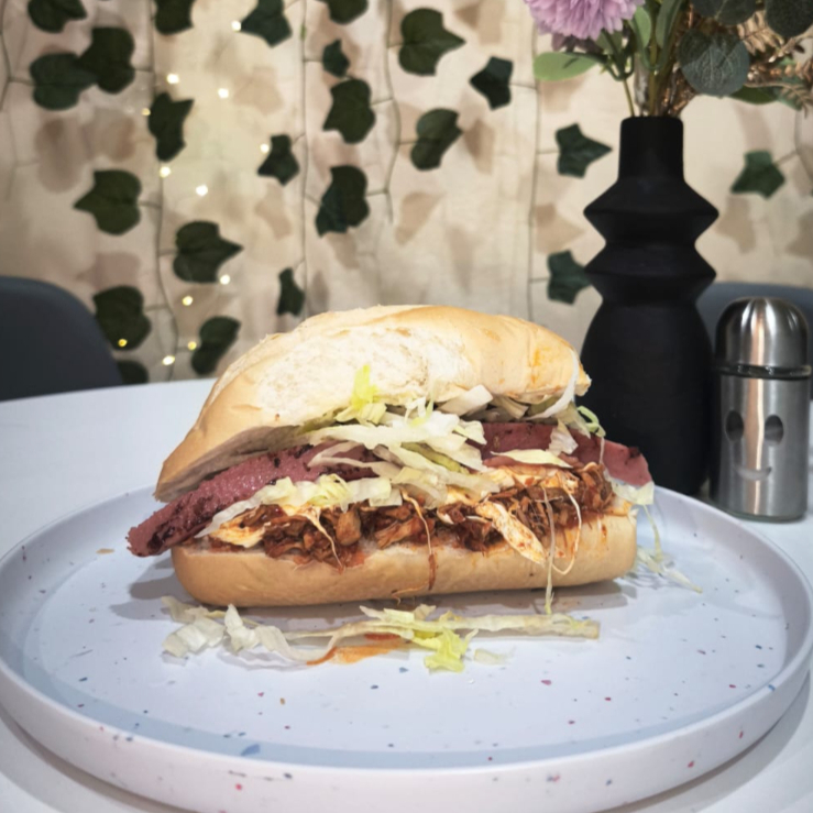 Torta acompañada con frijol, asado, jamón frito, salchicha frita, queso de hebra, lechuga y tomate