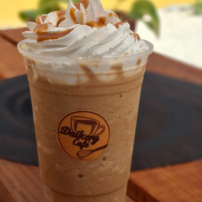 Cafe con leche frió con opción a jarabes de sabor y helado