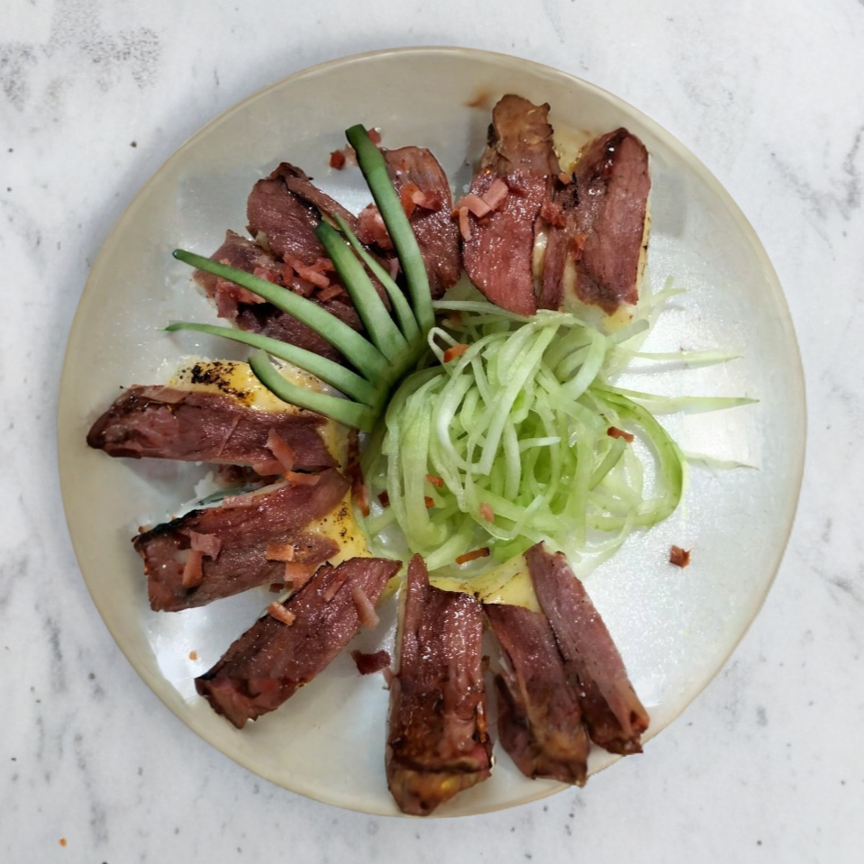 Cortes finos con cebollin, vinagreta y fideos de pepino