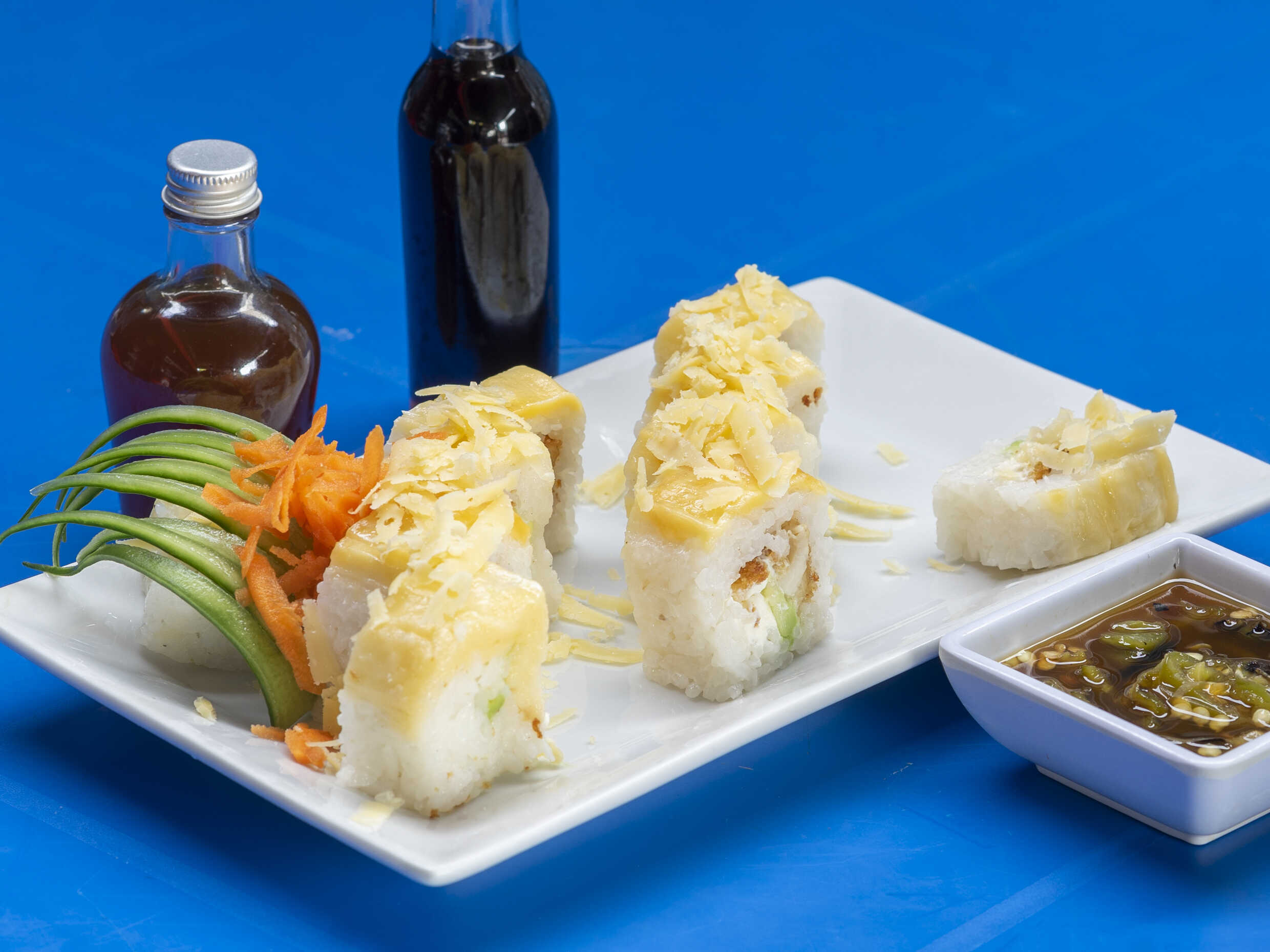 PF: Queso gratinado con chistorra y tocino bañado de salsa anguila Pd: Alga, Arrachera, pepino, y aguacate.
