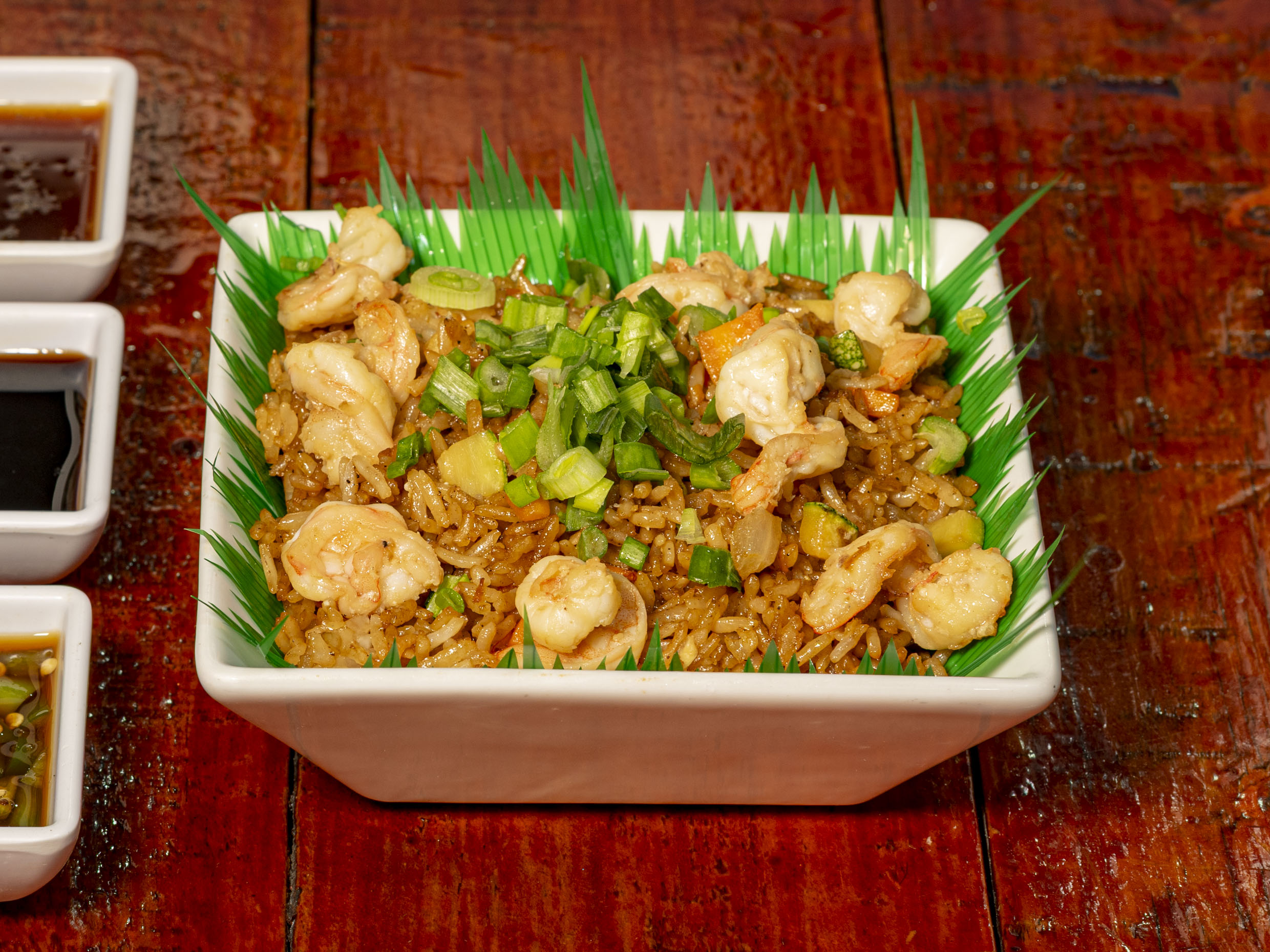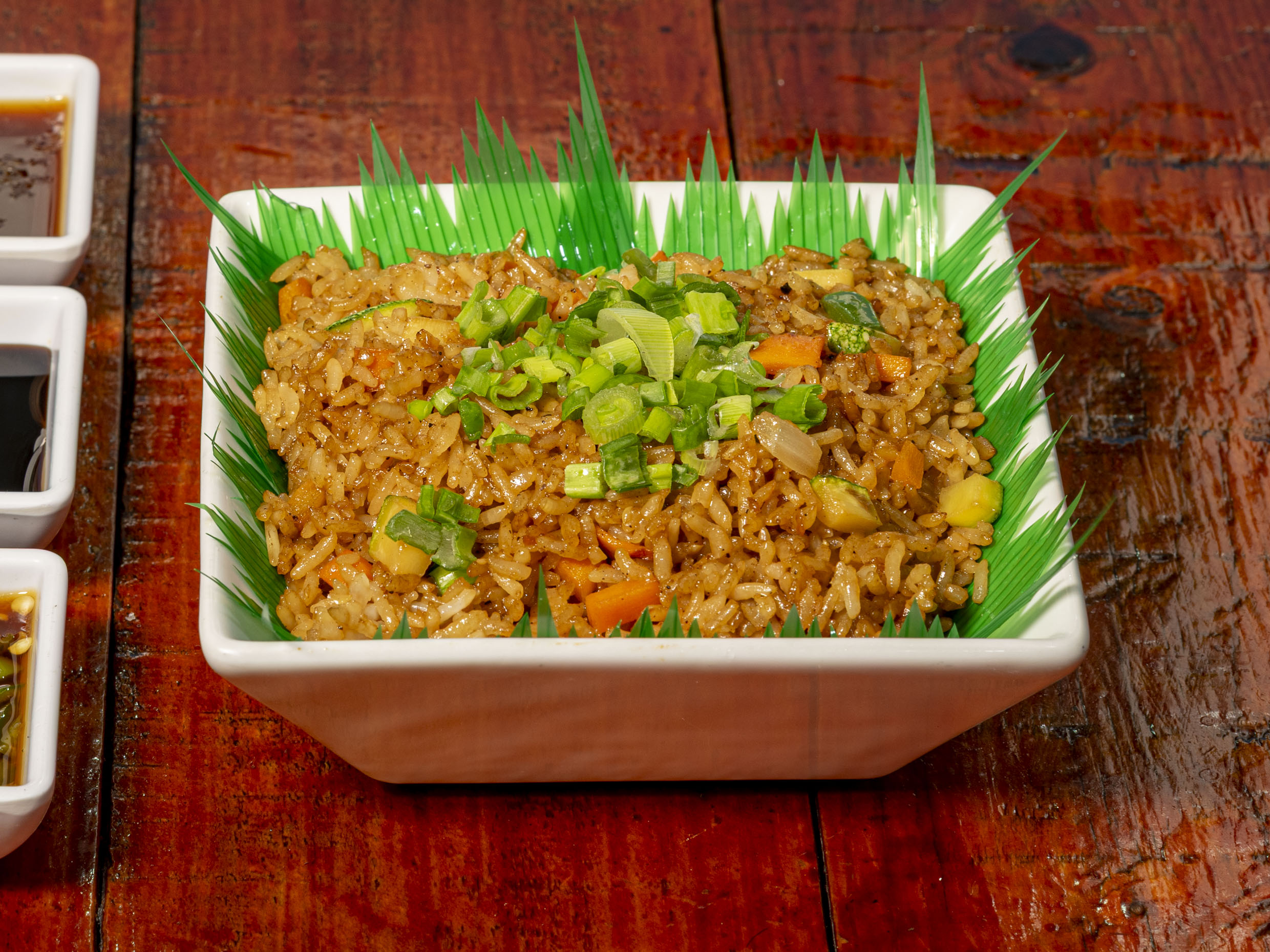 Arroz frito a la plancha sazonadas con soya y verduras tiene aguacate, Philadelphia con dos carnes a elegir (pollo, arrachera o camaron)