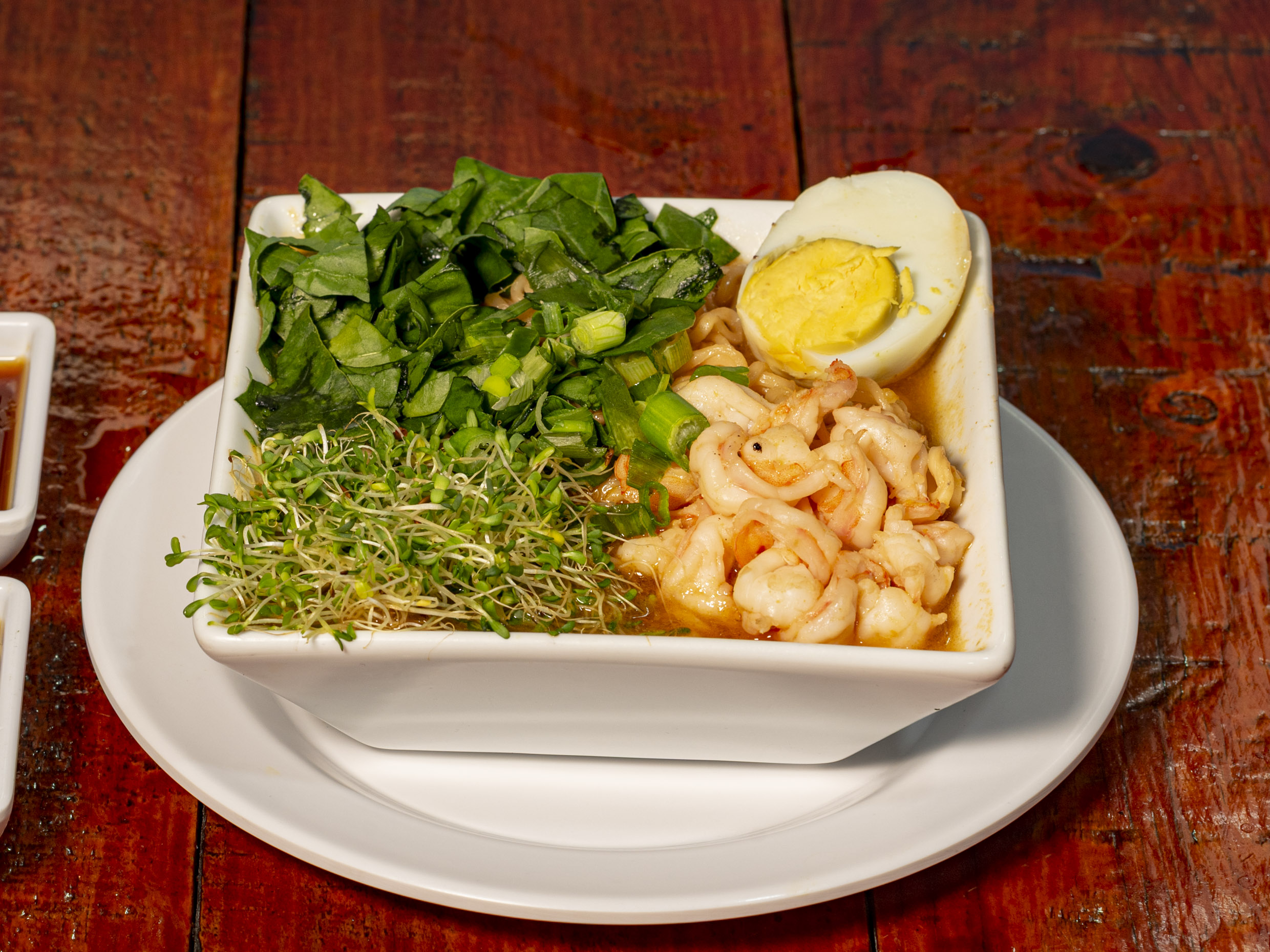Sopa de camarón acompañada de germinado de soya, espinaca, huevo y cebollin