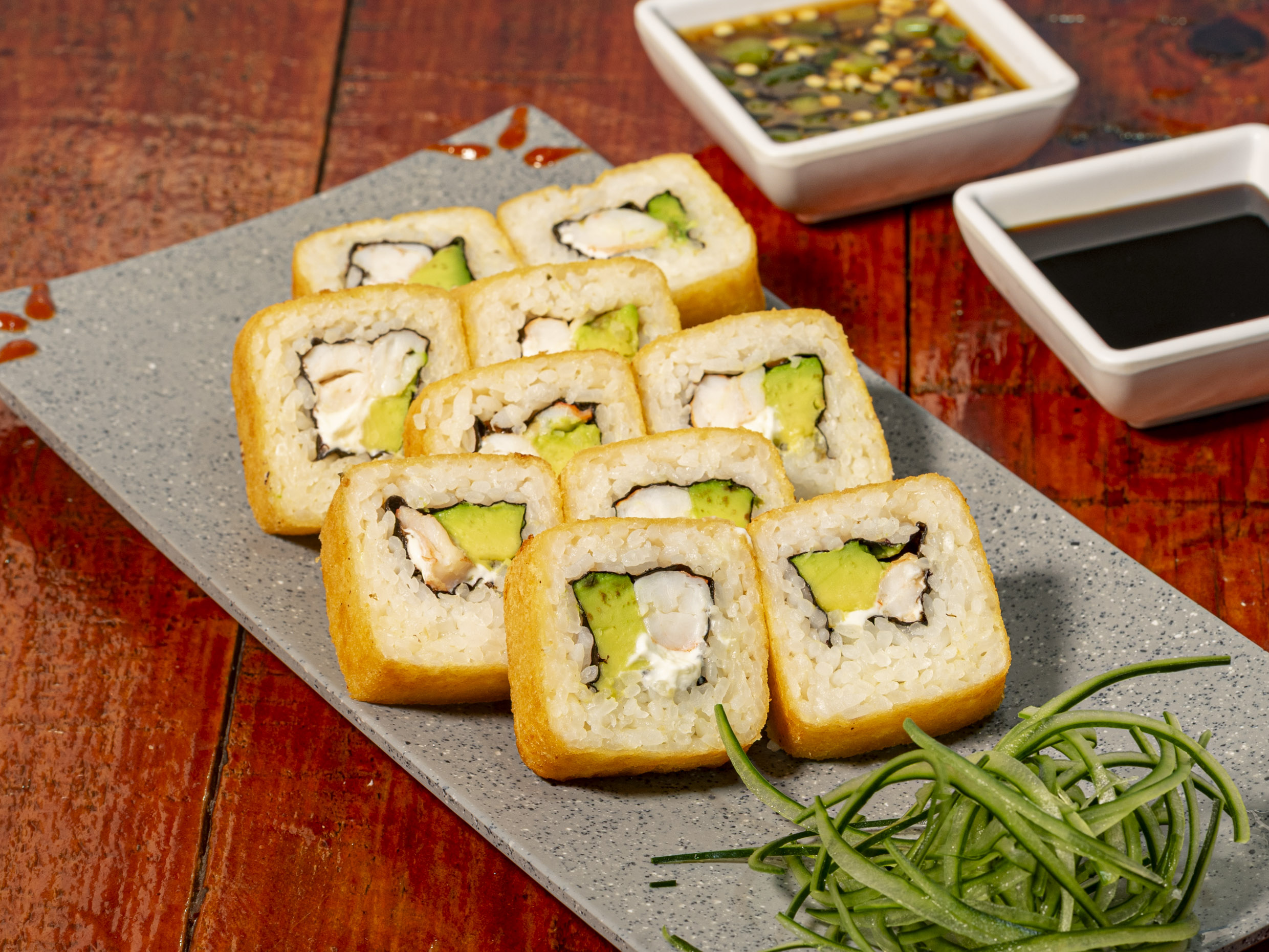 PF: Aguacate y tártara PD: Alga, Tampico, Philadelphia, camarón empanizado