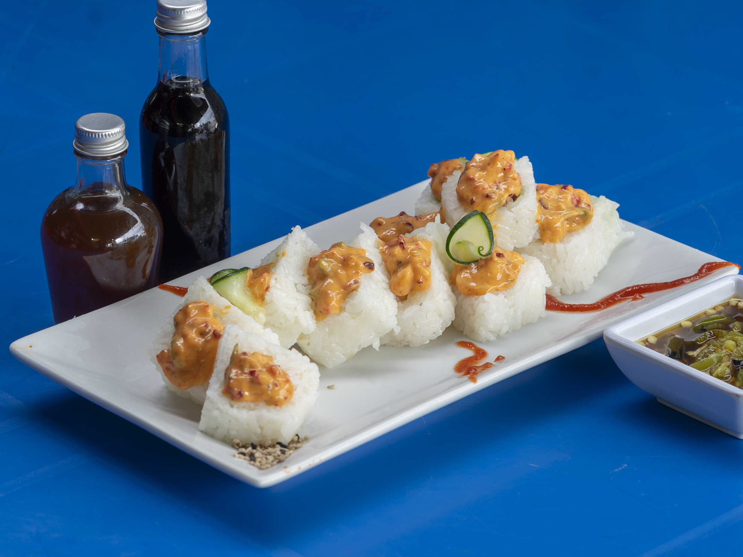 PF: camarón, pulpo topping de Tampico chipotle y aguacate PD: Alga, Salmón sellado y pepino