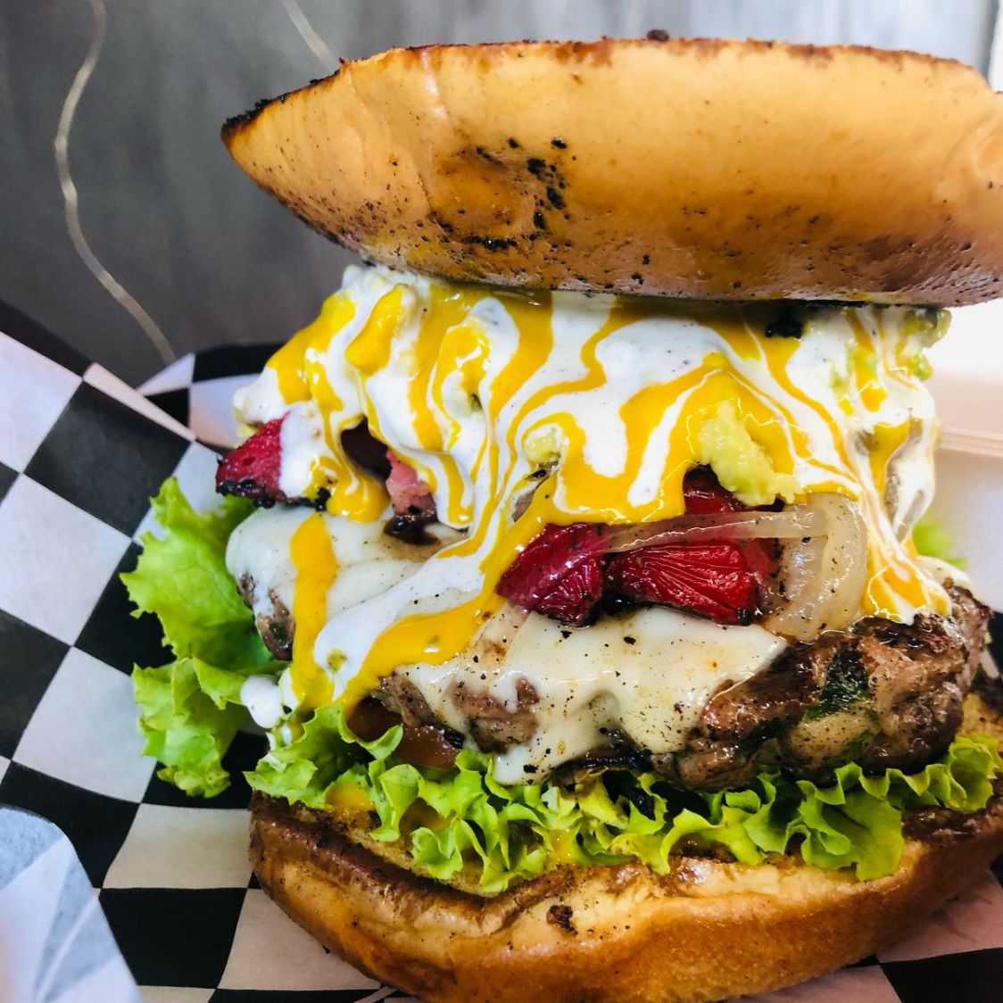Una mezcla de sabores con esta belleza de hamburguesa, aderezos de la casa, salchicha para asar y su respectivo guacamole,Incluyen porcion de papas fritas.