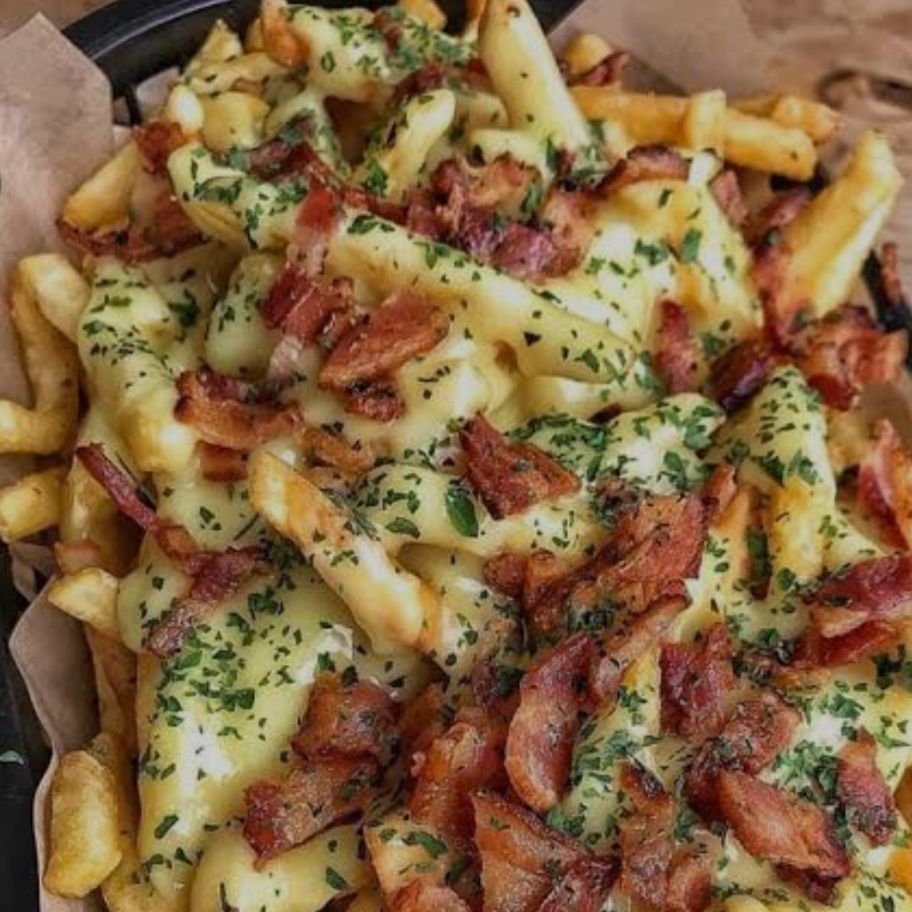 Papas francesas bañadas en salsa de queso, con crujientes de tocino