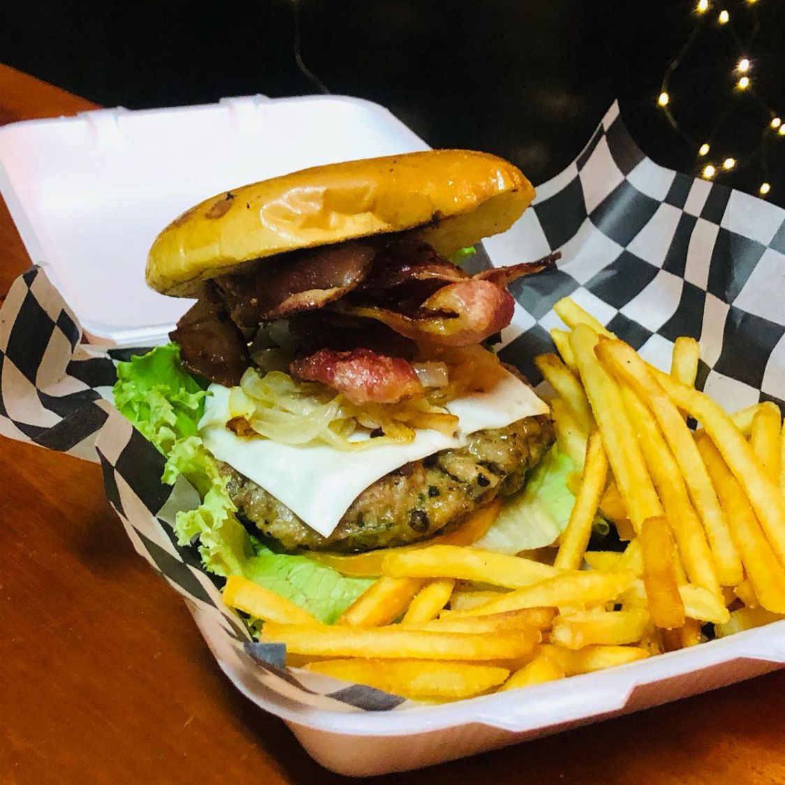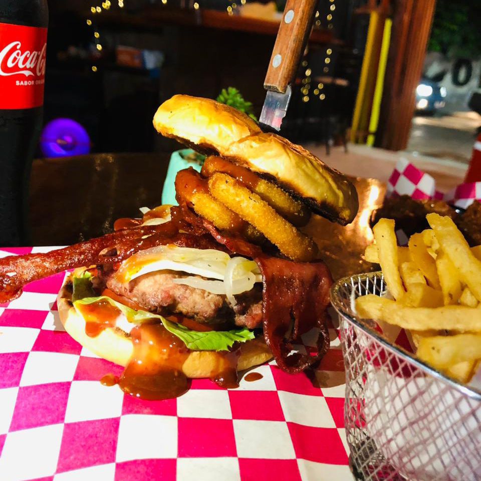 Carne 100% artesanal tocino, lechuga, tomate, cebolla. Incluyen porcion de papas fritas.