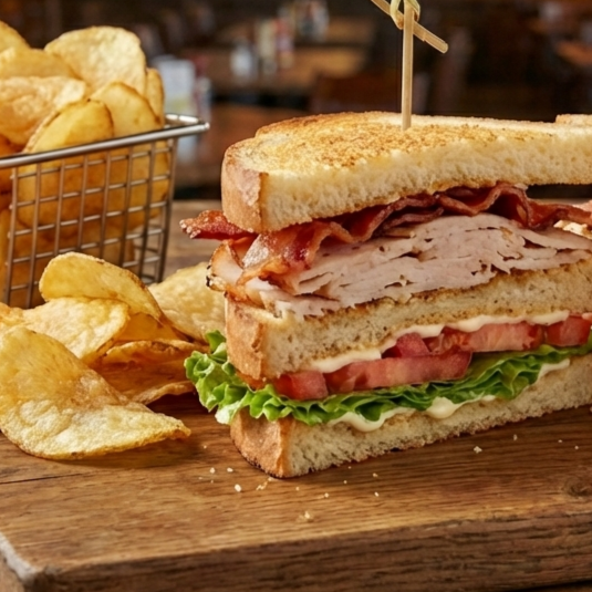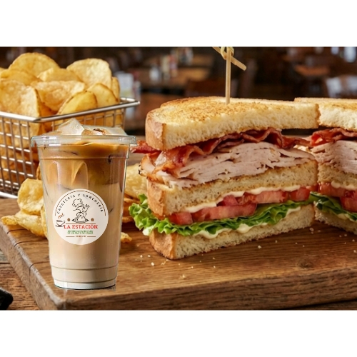 Hecho con 4 pz de pan de molde , aderezo de mayonesa , jamón de pavo , queso manchego , huevo , tocino frito , lechuga y rodajas de tomate , acompañado de papas tipo chips . Cortado en 4
