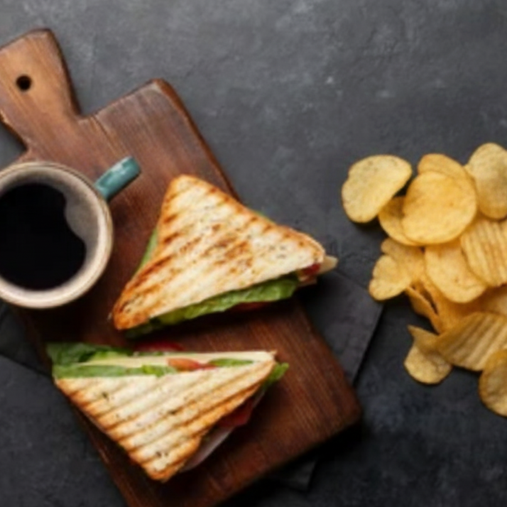 Hecho con 4 pz de pan de molde , aderezo de mayonesa , jamón de pavo , queso manchego , huevo , lechuga y rodajas de tomate , cortado en 4 , acompañado de papas tipo chips