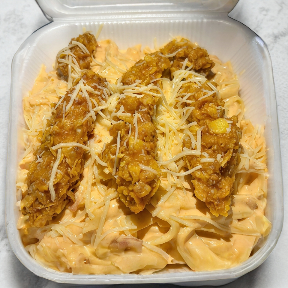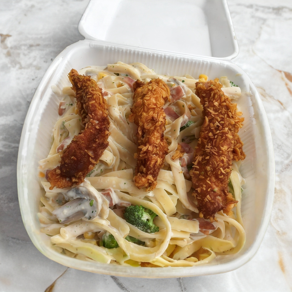 Deliciosa pasta fetuccini en salsa alfredo con brocoli, tocino, champiñones, elote, espolvoreado con queso parmesano y 3 tiras crispy crujientes acompañado de aderezos tamarindo y bufalo.