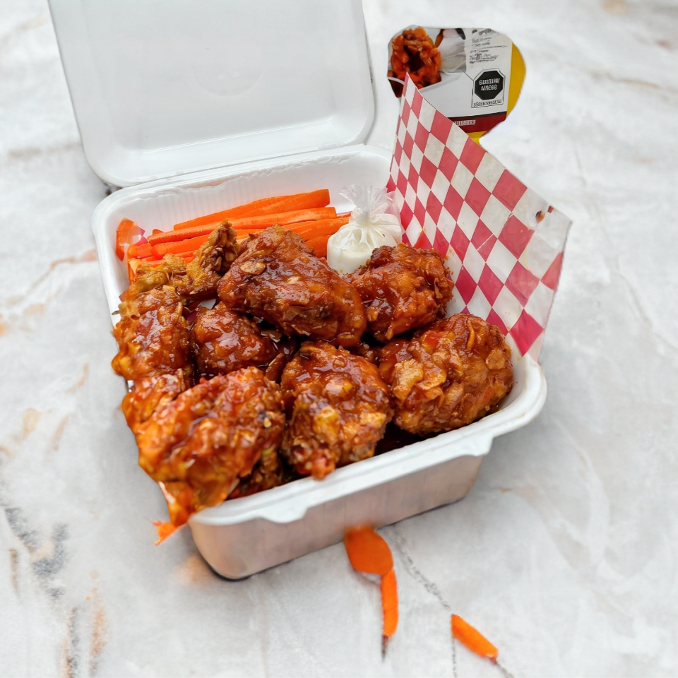 1/2 kg de boneless de pollo bañados con las salsas de tu preferencia acompañado de bastones de zanahoria y aderezo ranch