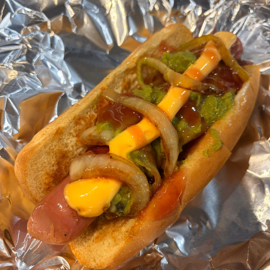 Dogo con guacamole, cebolla caramelizada, tocino, queso de nacho, catsup