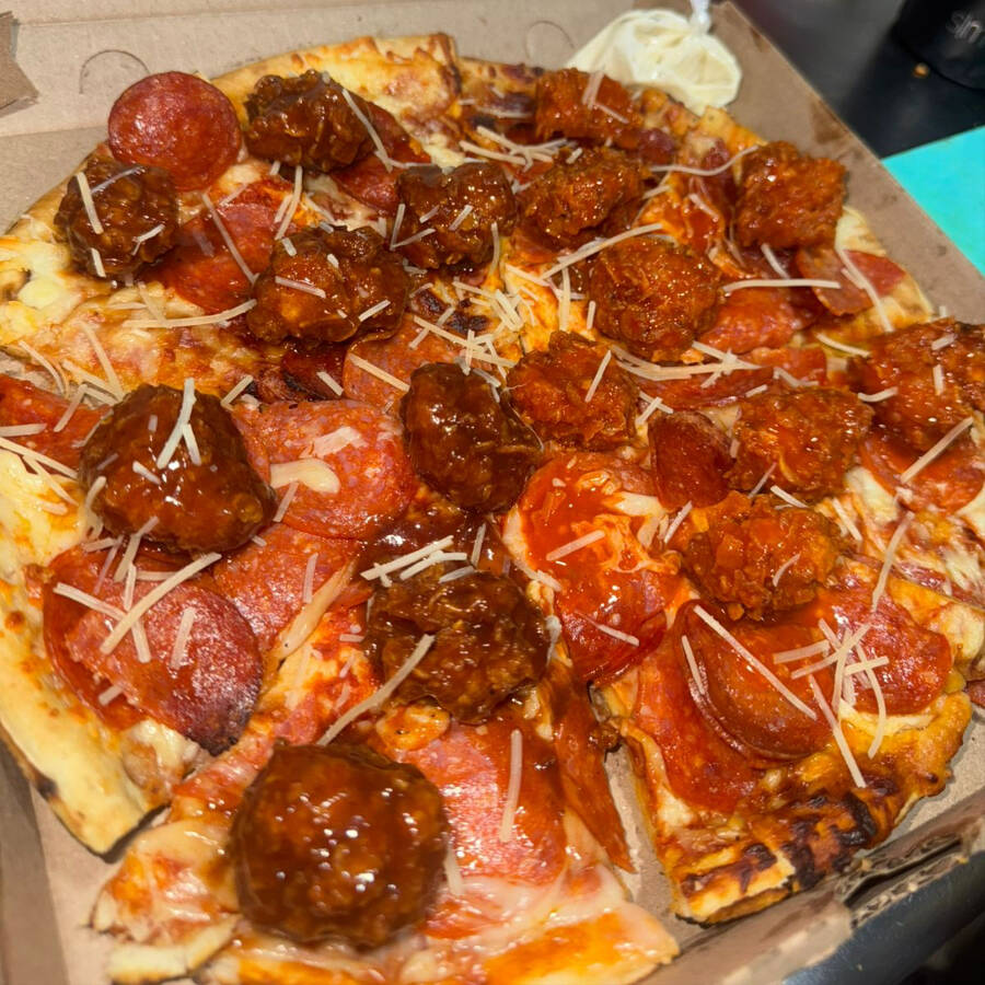Pizza individual de peperoni con 16 pzs de mini boneless bañados en dos aderezos de tu preferencia